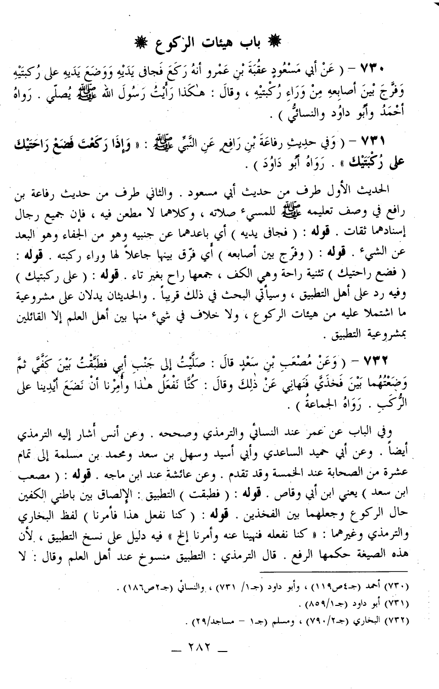 731 - (وَفِي حَدِيثِ رِفَاعَةَ بْنِ رَافِعٍ عَنْ النَّبِيِّ - صَلَّى اللَّهُ عَلَيْهِ وَسَلَّمَ -: «وَإِذَا رَكَعْتَ فَضَعْ رَاحَتَيْكَ عَلَى رُكْبَتَيْكَ» . رَوَاهُ أَبُو دَاوُد) .