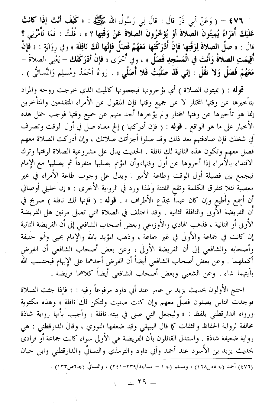 476 - (وَعَنْ أَبِي ذَرٍّ قَالَ: قَالَ لِي رَسُولُ اللَّهِ - صَلَّى اللَّهُ عَلَيْهِ وَسَلَّمَ -: «كَيْفَ أَنْتَ إذَا كَانَتْ عَلَيْكَ أُمَرَاءُ يُمِيتُونَ الصَّلَاةَ أَوْ يُؤَخِّرُونَ الصَّلَاةَ عَنْ وَقْتِهَا؟ ، قُلْت: فَمَا تَأْمُرنِي؟ قَالَ: صَلِّ الصَّلَاةَ لِوَقْتِهَا فَإِنْ أَدْرَكْتَهَا مَعَهُمْ فَصَلِّ فَإِنَّهَا لَك نَافِلَةٌ» وَفِي رِوَايَةٍ: «فَإِنْ أُقِيمَتْ الصَّلَاةُ وَأَنْتَ فِي الْمَسْجِدِ فَصَلِّ» ، وَفِي أُخْرَى «فَإِنْ أَدْرَكَتْكَ - يَعْنِي الصَّلَاةَ - مَعَهُمْ فَصَلِّ وَلَا تَقُلْ: إنِّي قَدْ صَلَّيْتُ فَلَا أُصَلِّي» . رَوَاهُ أَحْمَدُ وَمُسْلِمٌ وَالنَّسَائِيُّ) .