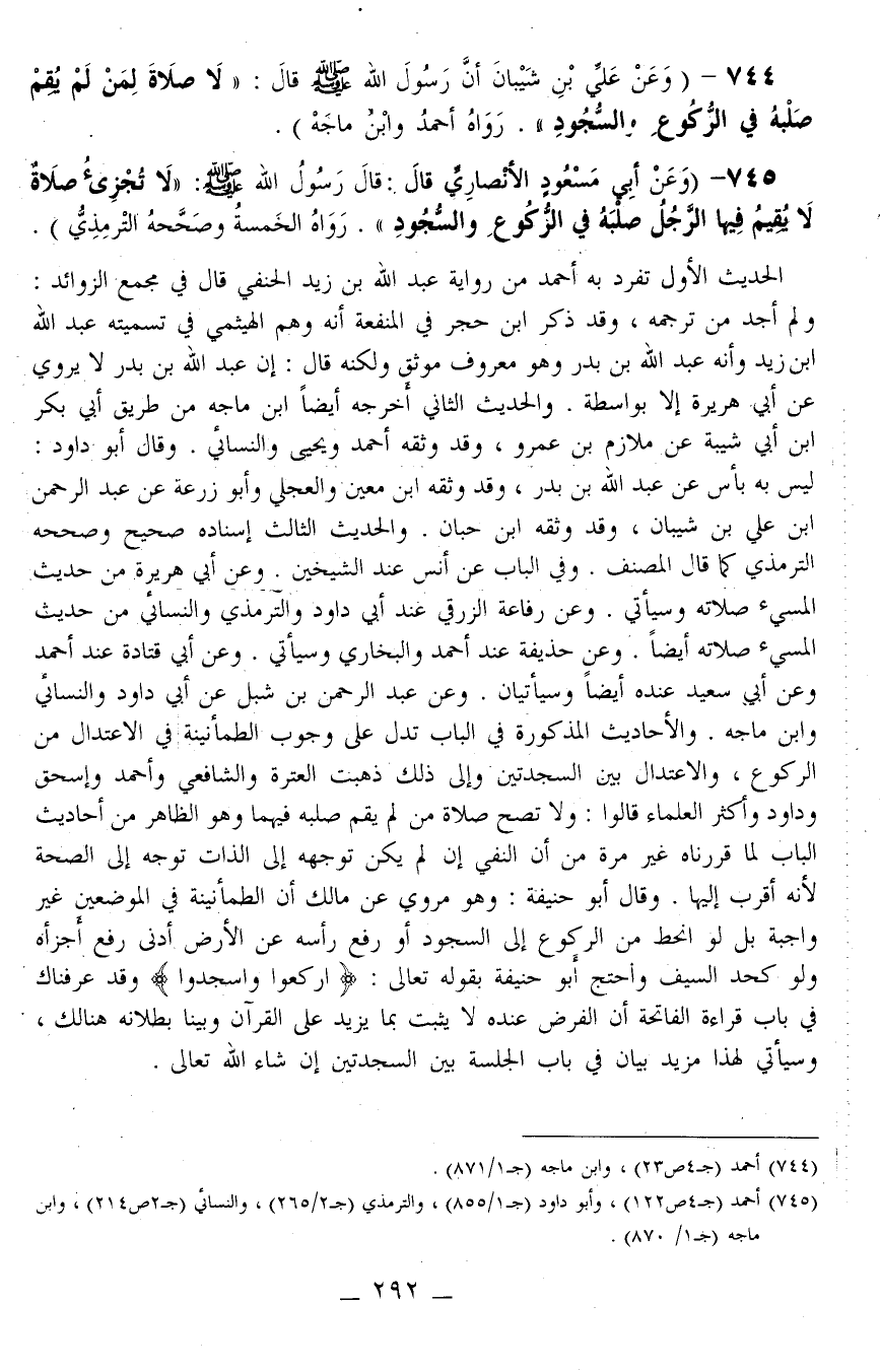 744 - (وَعَنْ عَلِيِّ بْنِ شَيْبَانُ أَنَّ رَسُولَ اللَّهِ - صَلَّى اللَّهُ عَلَيْهِ وَسَلَّمَ - قَالَ: «لَا صَلَاةَ لِمَنْ لَمْ يُقِمْ صُلْبَهُ فِي الرُّكُوعِ وَالسُّجُودِ.» رَوَاهُ أَحْمَدُ وَابْنُ مَاجَهْ) .