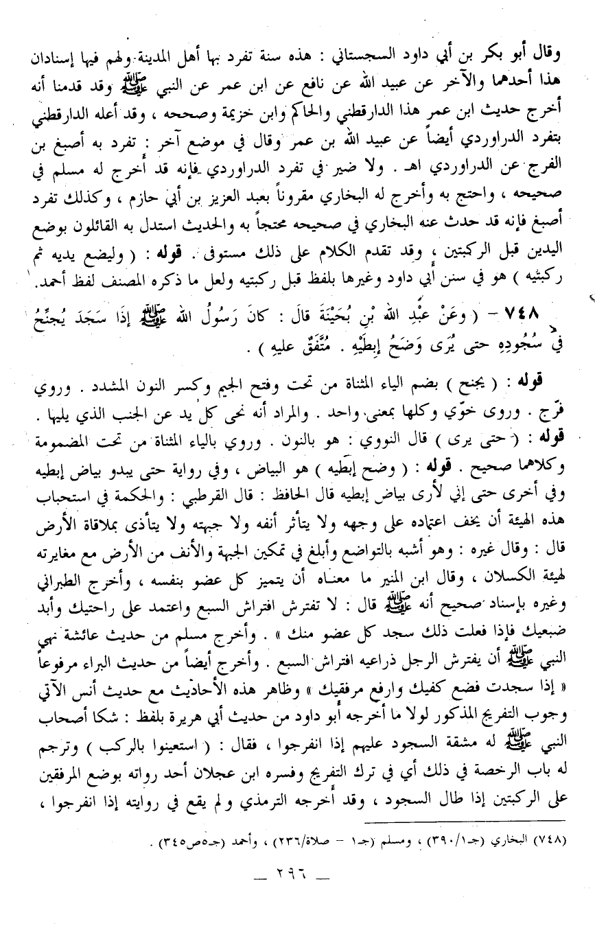 748 - (وَعَنْ عَبْدِ اللَّهِ ابْنِ بُحَيْنَةَ قَالَ: «كَانَ رَسُولُ اللَّهِ - صَلَّى اللَّهُ عَلَيْهِ وَسَلَّمَ - إذَا سَجَدَ يُجَنِّحُ فِي سُجُودِهِ حَتَّى يُرَى وَضَحُ إبِطَيْهِ» . مُتَّفَقٌ عَلَيْهِ) .