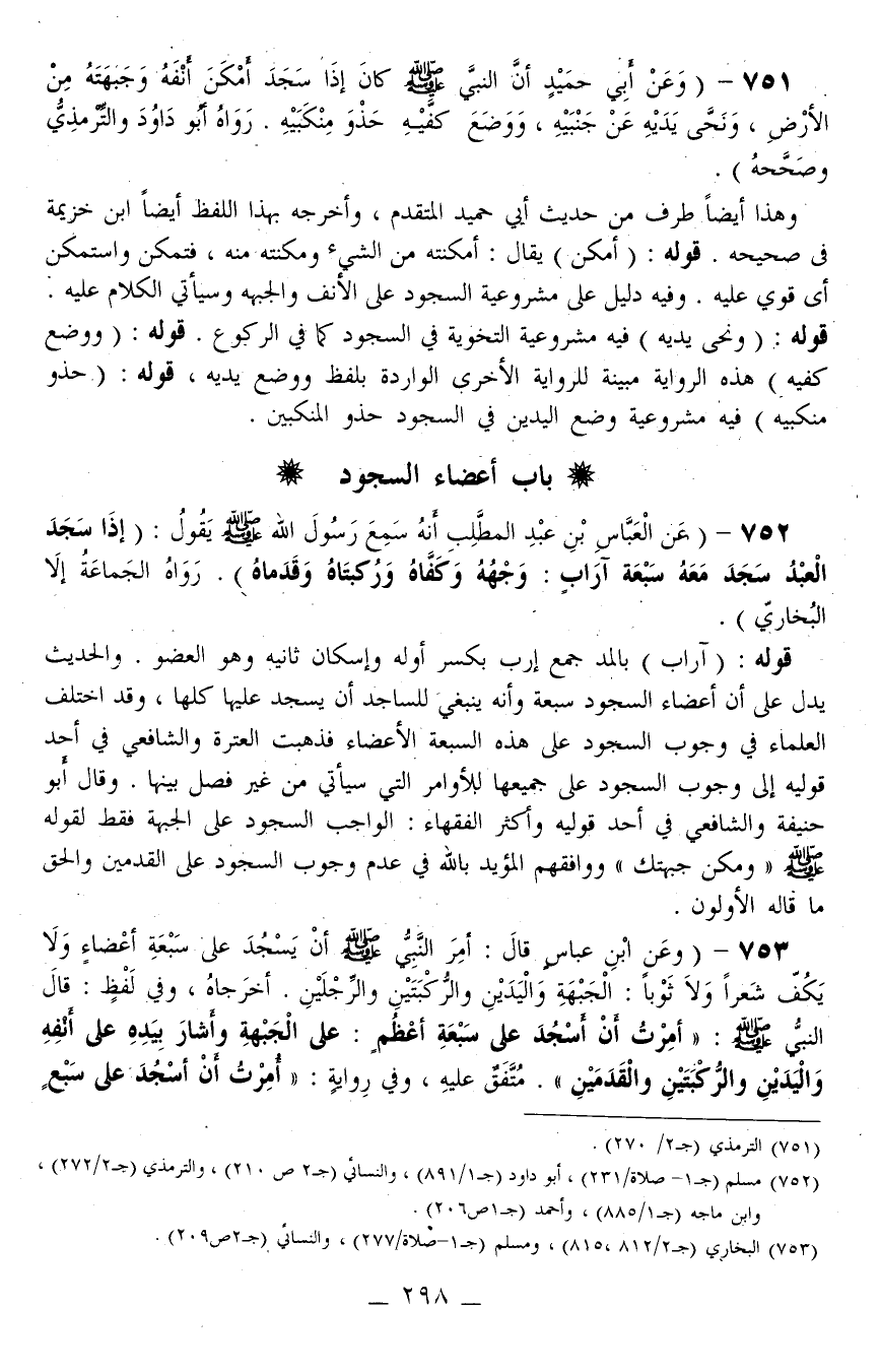 752 - (عَنْ الْعَبَّاسِ بْنِ عَبْدِ الْمُطَّلِبِ أَنَّهُ سَمِعَ رَسُولَ اللَّهِ - صَلَّى اللَّهُ عَلَيْهِ وَسَلَّمَ - يَقُولُ: «إذَا سَجَدَ الْعَبْدُ سَجَدَ مَعَهُ سَبْعَةُ آرَابٍ: وَجْهُهُ وَكَفَّاهُ وَرُكْبَتَاهُ وَقَدَمَاهُ» . رَوَاهُ الْجَمَاعَةُ إلَّا الْبُخَارِيَّ) .