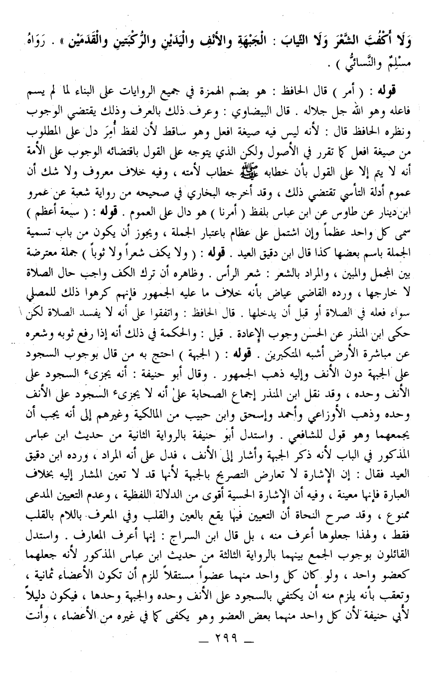 وَلَا أَكْفِت الشَّعْرَ وَلَا الثِّيَابَ: الْجَبْهَةِ وَالْأَنْفِ وَالْيَدَيْنِ وَالرُّكْبَتَيْنِ وَالْقَدَمَيْنِ» رَوَاهُ مُسْلِمٌ وَالنَّسَائِيُّ) .