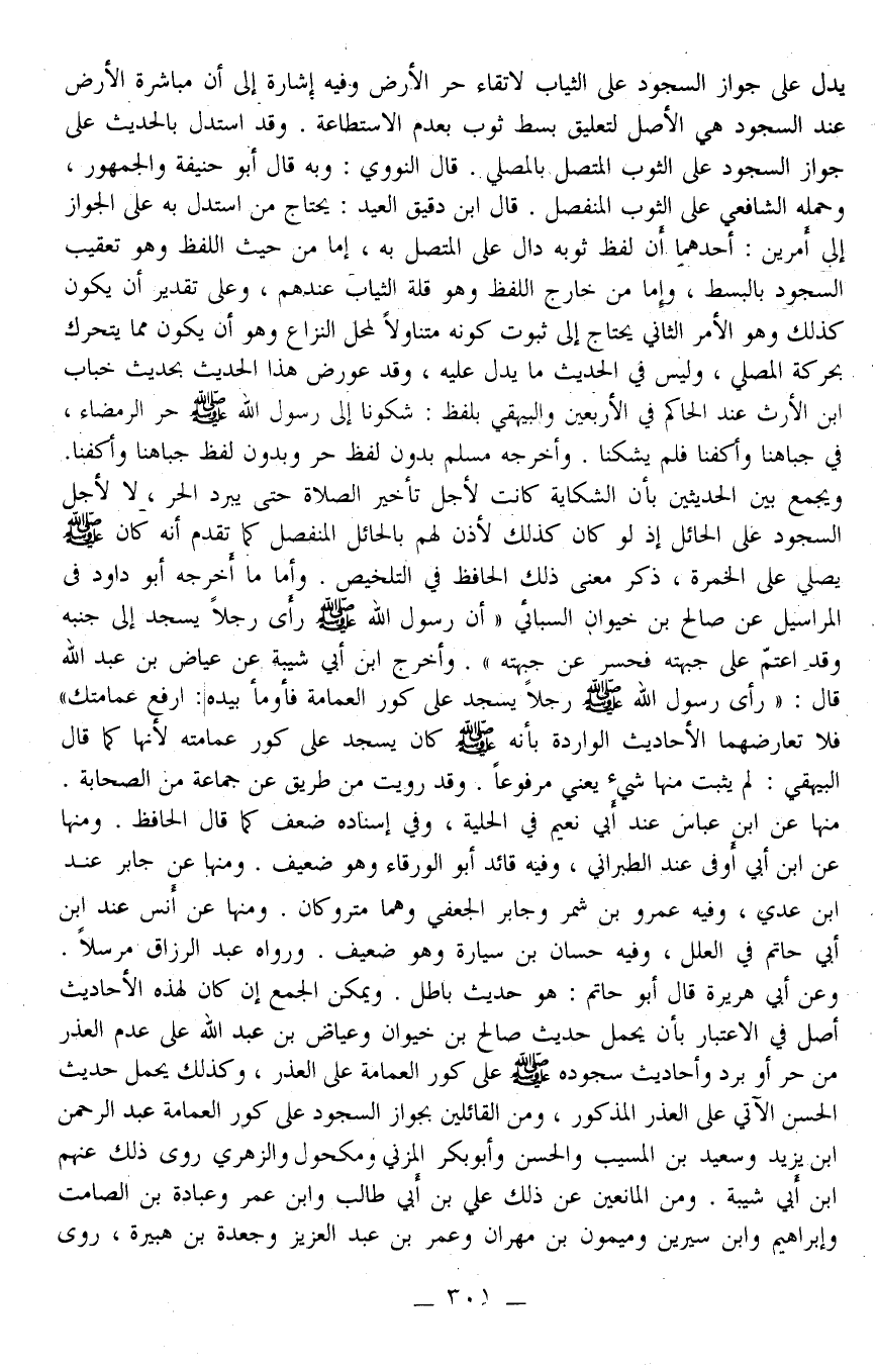 وَأَخْرَجَ ابْنُ أَبِي شَيْبَةَ عَنْ عِيَاضِ بْنِ عَبْدِ اللَّهِ قَالَ: «رَأَى رَسُولُ اللَّهِ - صَلَّى اللَّهُ عَلَيْهِ وَسَلَّمَ - رَجُلًا يَسْجُدُ عَلَى كَوْرِ الْعِمَامَةِ فَأَوْمَأَ بِيَدِهِ: ارْفَعْ عِمَامَتَك» فَلَا تُعَارِضُهُمَا الْأَحَادِيثُ الْوَارِدَةُ بِأَنَّهُ - صَلَّى اللَّهُ عَلَيْهِ وَسَلَّمَ - كَانَ يَسْجُدُ عَلَى كَوْرِ عِمَامَتِهِ لِأَنَّهَا كَمَا قَالَ الْبَيْهَقِيّ: لَمْ يَثْبُتْ مِنْهَا شَيْءٌ يَعْنِي مَرْفُوعًا. وَقَدْ رُوِيَتْ مِنْ طَرِيقٍ عَنْ جَمَاعَةٍ مِنْ الصَّحَابَةِ. مِنْهَا عَنْ ابْنِ عَبَّاسٍ عِنْدَ أَبِي نُعَيْمٍ فِي الْحِلْيَةِ، وَفِي إسْنَادِهِ ضَعْفٌ كَمَا قَالَ الْحَافِظُ. وَمِنْهَا عَنْ ابْنِ أَبِي أَوْفَى عِنْدَ الطَّبَرَانِيِّ، وَفِيهِ قَائِدٌ أَبُو الْوَرْقَاءِ وَهُوَ ضَعِيفٌ. وَمِنْهَا عَنْ جَابِرٍ عِنْدَ ابْنِ عَدِيٍّ، وَفِيهِ عَمْرُو بْنُ شِمْرٍ وَجَابِرٌ الْجُعْفِيُّ وَهُمَا مَتْرُوكَانِ. وَمِنْهَا عَنْ أَنَسٍ عِنْدَ ابْنِ أَبِي حَاتِمٍ فِي الْعِلَلِ، وَفِيهِ حَسَّانُ بْنُ سَيَّارَةَ وَهُوَ ضَعِيفٌ وَرَوَاهُ عَبْدُ الرَّزَّاقِ مُرْسَلًا. وَعَنْ أَبِي هُرَيْرَةَ قَالَ أَبُو حَاتِمٍ: هُوَ حَدِيثٌ بَاطِلٌ. وَيُمْكِنُ الْجَمْعُ إنْ كَانَ لِهَذِهِ الْأَحَادِيثِ أَصْلٌ فِي الِاعْتِبَارِ بِأَنْ يُحْمَلَ حَدِيثُ صَالِحِ بْنِ خَيْوَانَ وَعِيَاضِ بْنِ عَبْدِ اللَّهِ عَلَى عَدَمِ الْعُذْرِ مِنْ حَرٍّ أَوْ بَرْدٍ وَأَحَادِيثُ سُجُودِهِ - صَلَّى اللَّهُ عَلَيْهِ وَسَلَّمَ - عَلَى كَوْرِ الْعِمَامَةِ عَلَى الْعُذْرِ، وَكَذَلِكَ يُحْمَلُ حَدِيثُ الْحَسَنِ الْآتِي عَلَى الْعُذْرِ الْمَذْكُورِ، وَمِنْ الْقَائِلِينَ بِجَوَازِ السُّجُودِ عَلَى كَوْرِ الْعِمَامَةِ عَبْدُ الرَّحْمَنِ بْنُ يَزِيدَ وَسَعِيدُ بْنُ الْمُسَيِّبِ وَالْحَسَنُ وَأَبُو بَكْرٍ الْمُزَنِيّ وَمَكْحُولٌ وَالزُّهْرِيُّ رَوَى ذَلِكَ عَنْهُمْ ابْنُ أَبِي شَيْبَةَ. وَمِنْ الْمَانِعِينَ عَنْ ذَلِكَ عَلِيُّ بْنُ أَبِي طَالِبٍ وَابْنُ عُمَرَ وَعُبَادَةُ بْنُ الصَّامِتِ وَإِبْرَاهِيمُ وَابْنُ سِيرِينَ وَمَيْمُونِ بْنُ مِهْرَانَ وَعُمَرُ بْنُ عَبْدِ الْعَزِيزِ وَجَعْدَةُ بْنُ هُبَيْرَةَ، رَوَى