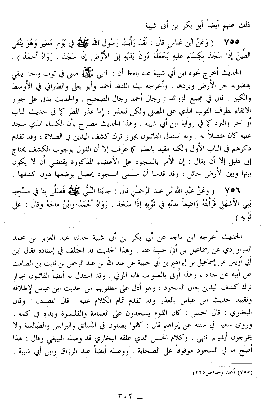756 - (وَعَنْ عَبْدِ اللَّهِ بْنِ عَبْدِ الرَّحْمَنِ قَالَ: «جَاءَنَا النَّبِيُّ - صَلَّى اللَّهُ عَلَيْهِ وَسَلَّمَ - فَصَلَّى بِنَا فِي مَسْجِدِ بَنِي الْأَشْهَلِ فَرَأَيْتُهُ وَاضِعًا يَدَيْهِ فِي ثَوْبِهِ إذَا سَجَدَ» . رَوَاهُ أَحْمَدُ وَابْنُ مَاجَهْ وَقَالَ: عَلَى ثَوْبِهِ) . الْحَدِيثُ أَخْرَجَهُ ابْنُ مَاجَهْ عَنْ أَبِي بَكْرِ بْنِ أَبِي شَيْبَةَ حَدَّثَنَا عَبْدُ الْعَزِيزِ بْنُ مُحَمَّدٍ الدَّرَاوَرْدِيُّ عَنْ إسْمَاعِيلَ بْنِ أَبِي حَبِيبَةَ عَنْهُ. وَهَذَا الْحَدِيثُ قَدْ اُخْتُلِفَ فِي إسْنَادِهِ فَقَالَ ابْنُ أَبِي أُوَيْسٍ عَنْ إسْمَاعِيلَ بْنِ إبْرَاهِيمَ بْنِ أَبِي حَبِيبَةَ عَنْ عَبْدِ اللَّهِ بْنِ عَبْدِ الرَّحْمَنِ بْنِ ثَابِتِ بْنِ الصَّامِتِ عَنْ أَبِيهِ عَنْ جَدِّهِ، وَهَذَا أَوْلَى بِالصَّوَابِ قَالَهُ الْمُزَنِيّ. وَقَدْ اسْتَدَلَّ بِهِ أَيْضًا الْقَائِلُونَ بِجَوَازِ تَرْكِ كَشْفِ الْيَدَيْنِ حَالَ السُّجُودِ، وَهُوَ أَدَلُّ عَلَى مَطْلُوبِهِمْ مِنْ حَدِيثِ ابْنِ عَبَّاسٍ لِإِطْلَاقِهِ وَتَقْيِيدِ حَدِيثِ ابْنِ عَبَّاسٍ بِالْعُذْرِ وَقَدْ تَقَدَّمَ تَمَامُ الْكَلَامِ عَلَيْهِ