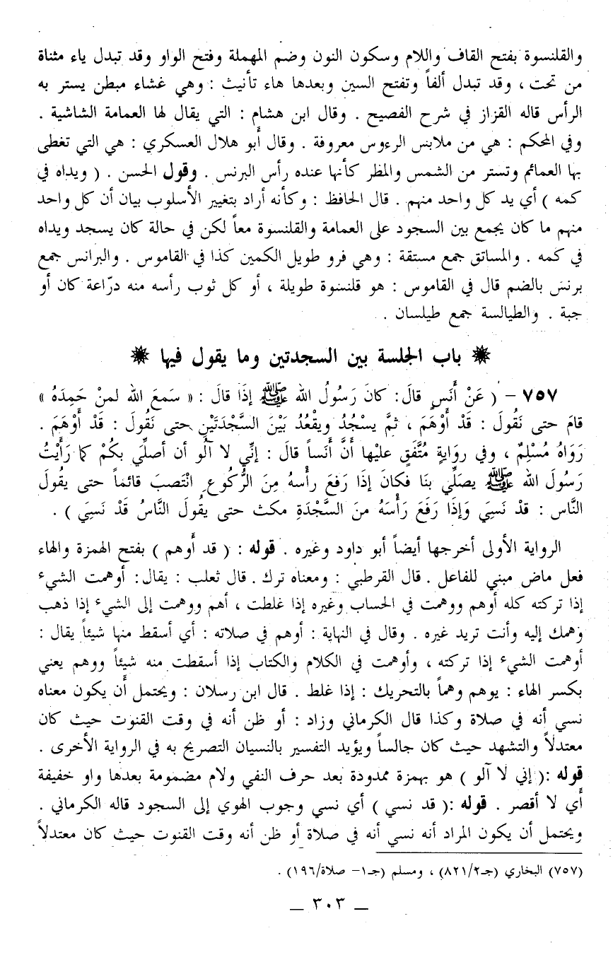 757 - (عَنْ أَنَسٍ قَالَ: «كَانَ رَسُولُ اللَّهِ - صَلَّى اللَّهُ عَلَيْهِ وَسَلَّمَ - إذَا قَالَ: سَمِعَ اللَّهُ لِمَنْ حَمِدَهُ قَامَ حَتَّى نَقُولَ: قَدْ أَوْهَمَ، ثُمَّ يَسْجُدُ وَيَقْعُدُ بَيْنَ السَّجْدَتَيْنِ حَتَّى نَقُولَ: قَدْ أَوْهَمَ» . رَوَاهُ مُسْلِمٌ، وَفِي رِوَايَةٍ مُتَّفَقٍ عَلَيْهَا أَنَّ أَنَسًا قَالَ: «إنِّي لَا آلُو أَنْ أُصَلِّيَ بِكُمْ كَمَا رَأَيْتُ رَسُولَ اللَّهِ - صَلَّى اللَّهُ عَلَيْهِ وَسَلَّمَ - يُصَلِّي بِنَا فَكَانَ إذَا رَفَعَ رَأْسَهُ مِنْ الرُّكُوعِ انْتَصَبَ قَائِمًا حَتَّى يَقُولَ النَّاسُ: قَدْ نَسِيَ وَإِذَا رَفَعَ رَأْسَهُ مِنْ السَّجْدَةِ مَكَثَ حَتَّى يَقُولَ النَّاسُ قَدْ نَسِيَ» .