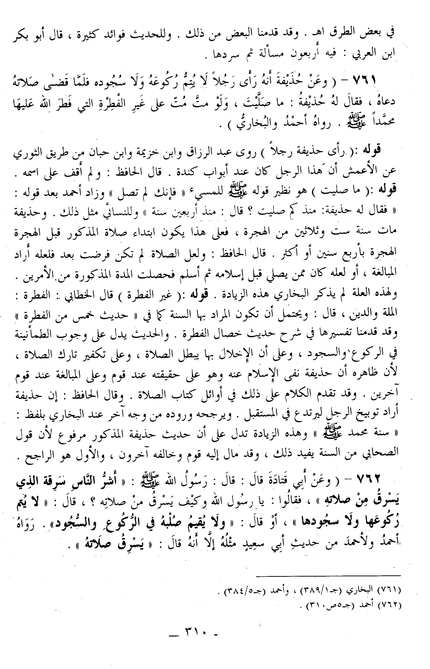 761 - (وَعَنْ حُذَيْفَةَ «أَنَّهُ رَأَى رَجُلًا لَا يُتِمُّ رُكُوعَهُ وَلَا سُجُودَهُ فَلَمَّا قَضَى صَلَاتَهُ دَعَاهُ، فَقَالَ لَهُ حُذَيْفَةُ: مَا صَلَّيْتَ، وَلَوْ مِتَّ مِتَّ عَلَى غَيْرِ الْفِطْرَةِ الَّتِي فَطَرَ اللَّهُ عَلَيْهَا مُحَمَّدًا - صَلَّى اللَّهُ عَلَيْهِ وَسَلَّمَ -» رَوَاهُ أَحْمَدُ وَالْبُخَارِيُّ) .