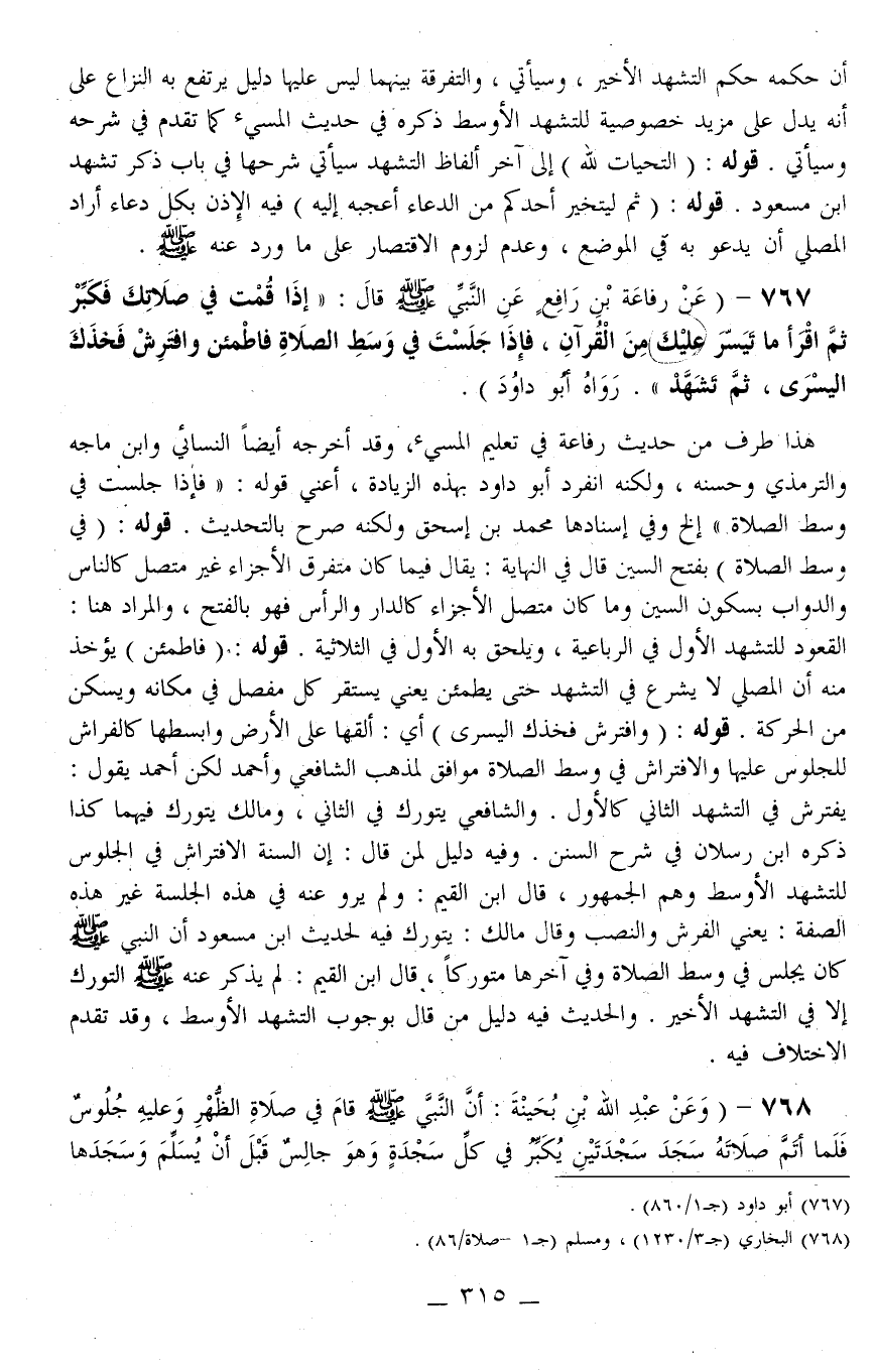 767 - (عَنْ رِفَاعَةَ بْنِ رَافِعٍ عَنْ النَّبِيِّ - صَلَّى اللَّهُ عَلَيْهِ وَسَلَّمَ - قَالَ: «إذَا قُمْتَ فِي صَلَاتك فَكَبِّرْ ثُمَّ اقْرَأْ مَا تَيَسَّرَ عَلَيْكَ مِنْ الْقُرْآنِ، فَإِذَا جَلَسْتَ فِي وَسَطِ الصَّلَاةِ فَاطْمَئِنَّ وَافْتَرِشْ فَخِذَكَ الْيُسْرَى، ثُمَّ تَشَهَّدْ» . رَوَاهُ أَبُو دَاوُد) . هَذَا طَرَفٌ مِنْ حَدِيثِ رِفَاعَةَ فِي تَعْلِيمِ الْمُسِيءِ، وَقَدْ أَخْرَجَهُ أَيْضًا النَّسَائِيّ وَابْنُ مَاجَهْ وَالتِّرْمِذِيُّ وَحَسَّنَهُ، وَلَكِنَّهُ انْفَرَدَ أَبُو دَاوُد بِهَذِهِ الزِّيَادَةِ، أَعْنِي قَوْلَهُ: " فَإِذَا جَلَسْتَ فِي وَسَطِ الصَّلَاةِ ". . . إلَخْ وَفِي إسْنَادِهَا مُحَمَّدُ بْنُ إِسْحَاقَ وَلَكِنَّهُ صَرَّحَ بِالتَّحْدِيثِ.