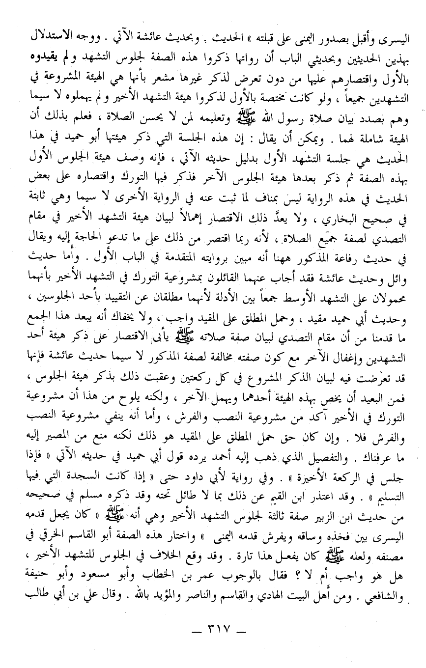 وَقَدْ اعْتَذَرَ ابْنُ الْقَيِّمِ عَنْ ذَلِكَ بِمَا لَا طَائِلَ تَحْتَهُ وَقَدْ ذَكَرَهُ مُسْلِمٌ فِي صَحِيحِهِ مِنْ حَدِيثِ ابْنِ الزُّبَيْرِ صِفَةً ثَالِثَةً لِجُلُوسِ التَّشَهُّدِ الْأَخِيرِ وَهِيَ أَنَّهُ - صَلَّى اللَّهُ عَلَيْهِ وَسَلَّمَ - «كَانَ يَجْعَلُ قَدَمَهُ الْيُسْرَى بَيْنَ فَخِذِهِ وَسَاقِهِ وَيَفْرِشُ قَدَمَهُ الْيُمْنَى» وَاخْتَارَ هَذِهِ الصِّفَةَ أَبُو الْقَاسِمِ الْخِرَقِيِّ فِي مُصَنَّفِهِ وَلَعَلَّهُ - صَلَّى اللَّهُ عَلَيْهِ وَسَلَّمَ - كَانَ يَفْعَلُ هَذَا تَارَةً. وَقَدْ وَقَعَ الْخِلَافُ فِي الْجُلُوسِ لِلتَّشَهُّدِ الْأَخِيرِ، هَلْ هُوَ وَاجِبٌ أَمْ لَا؟ فَقَالَ بِالْوُجُوبِ عُمَرُ بْنُ الْخَطَّابِ وَأَبُو مَسْعُودٍ وَأَبُو حَنِيفَةَ وَالشَّافِعِيُّ. وَمِنْ أَهْلِ الْبَيْتِ الْهَادِي وَالْقَاسِمُ وَالنَّاصِرُ وَالْمُؤَيَّدُ بِاَللَّهِ وَقَالَ عَلِيُّ بْنُ أَبِي طَالِبٍ