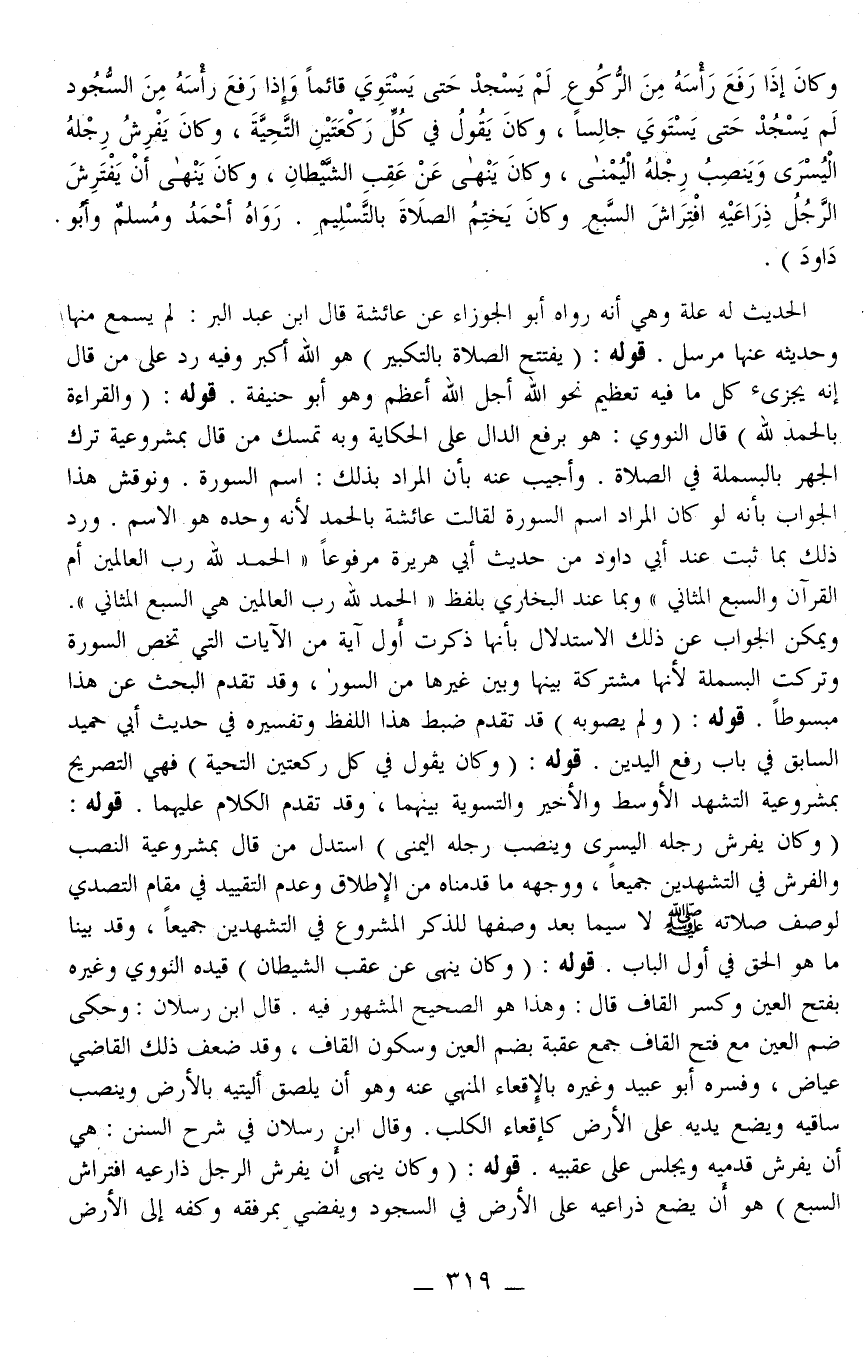 قَوْلُهُ: (وَكَانَ يَفْرِشُ رِجْلَهُ الْيُسْرَى وَيَنْصِبُ رِجْلَهُ الْيُمْنَى) اسْتَدَلَّ مَنْ قَالَ بِمَشْرُوعِيَّةِ النَّصْبِ وَالْفَرْشِ فِي التَّشَهُّدَيْنِ جَمِيعًا، وَوَجْهُهُ مَا قَدَّمْنَاهُ مِنْ الْإِطْلَاقِ وَعَدَمِ التَّقْيِيدِ فِي مَقَامِ التَّصَدِّي لِوَصْفِ صَلَاتِهِ - صَلَّى اللَّهُ عَلَيْهِ وَسَلَّمَ - لَا سِيَّمَا بَعْدَ وَصْفِهَا لِلذِّكْرِ الْمَشْرُوعِ فِي التَّشَهُّدَيْنِ جَمِيعًا، وَقَدْ بَيَّنَّا مَا هُوَ الْحَقُّ فِي أَوَّلِ الْبَابِ. قَوْلُهُ: (وَكَانَ يَنْهَى عَنْ عَقِبِ الشَّيْطَانِ) قَيَّدَهُ النَّوَوِيُّ وَغَيْرُهُ بِفَتْحِ الْعَيْنِ وَكَسْرِ الْقَافِ قَالَ: وَهَذَا هُوَ الصَّحِيحُ الْمَشْهُورُ فِيهِ. قَالَ ابْنُ رَسْلَانَ: وَحُكِيَ ضَمُّ الْعَيْنِ مَعَ فَتْحِ الْقَافِ جَمْعُ عُقْبَةٍ بِضَمِّ الْعَيْنِ وَسُكُونِ الْقَافِ، وَقَدْ ضَعَّفَ ذَلِكَ الْقَاضِي عِيَاضٌ، وَفَسَّرَهُ أَبُو عُبَيْدٍ وَغَيْرُهُ بِالْإِقْعَاءِ الْمَنْهِيِّ عَنْهُ وَهُوَ أَنْ يُلْصِقَ أَلْيَتَيْهِ بِالْأَرْضِ وَيَنْصِبَ سَاقَيْهِ وَيَضَعَ يَدَيْهِ عَلَى الْأَرْضِ كَإِقْعَاءِ الْكَلْبِ. وَقَالَ ابْنُ رَسْلَانَ فِي شَرْحِ السُّنَنِ: هِيَ أَنْ يَفْرِشَ قَدَمَيْهِ وَيَجْلِسَ عَلَى عَقِبَيْهِ