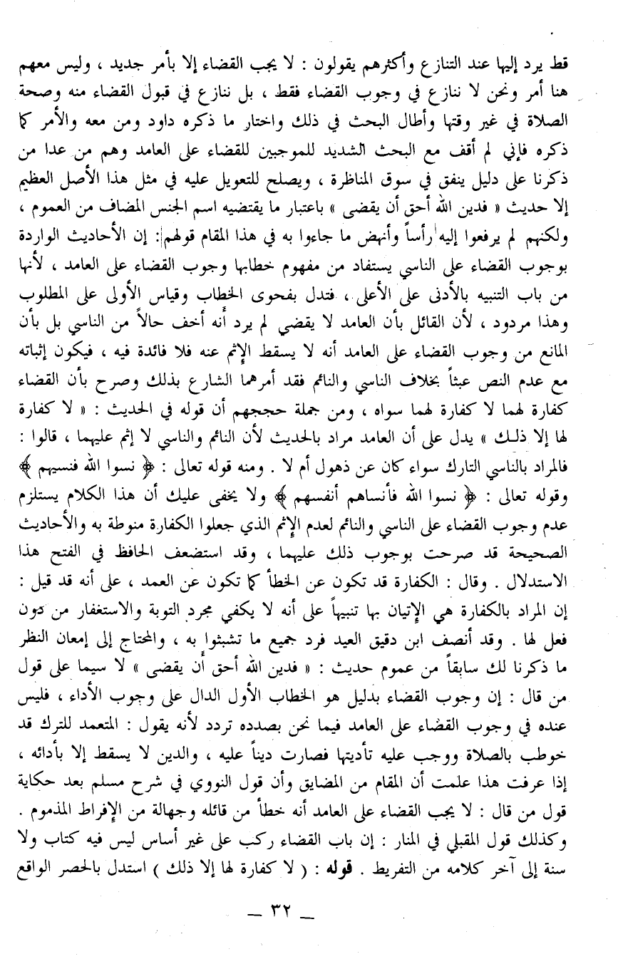 ـــــــــــــــــــــــــــــQقَطُّ يُرَدُّ إلَيْهَا عِنْدَ التَّنَازُعِ وَأَكْثَرُهُمْ يَقُولُونَ: لَا يَجِبُ الْقَضَاءُ إلَّا بِأَمْرٍ جَدِيدٍ، وَلَيْسَ مَعَهُمْ هُنَا أَمْرٌ وَنَحْنُ لَا نُنَازِعُ فِي وُجُوبِ الْقَضَاءِ فَقَطْ، بَلْ نُنَازِعُ فِي قَبُولِ الْقَضَاءِ مِنْهُ وَصِحَّةِ الصَّلَاةِ فِي غَيْرِ وَقْتِهَا وَأَطَالَ الْبَحْثَ فِي ذَلِكَ وَاخْتَارَ مَا ذَكَرَهُ دَاوُد وَمَنْ مَعَهُ وَالْأَمْرُ كَمَا ذَكَرَهُ فَإِنِّي لَمْ أَقِفْ مَعَ الْبَحْثِ الشَّدِيدِ لِلْمُوجِبِينَ لِلْقَضَاءِ عَلَى الْعَامِدِ وَهُمْ مَنْ عَدَا مَنْ ذَكَرْنَا عَلَى دَلِيلٍ يُنْفَقُ فِي سُوقِ الْمُنَاظَرَةِ، وَيَصْلُحُ لِلتَّعْوِيلِ عَلَيْهِ فِي مِثْلِ هَذَا الْأَصْلِ الْعَظِيمِ إلَّا حَدِيثَ «فَدَيْنُ اللَّهِ أَحَقُّ أَنْ يُقْضَى» بِاعْتِبَارِ مَا يَقْتَضِيهِ اسْمُ الْجِنْسِ الْمُضَافِ مِنْ الْعُمُومِ، وَلَكِنَّهُمْ لَمْ يَرْفَعُوا إلَيْهِ رَأْسًا.