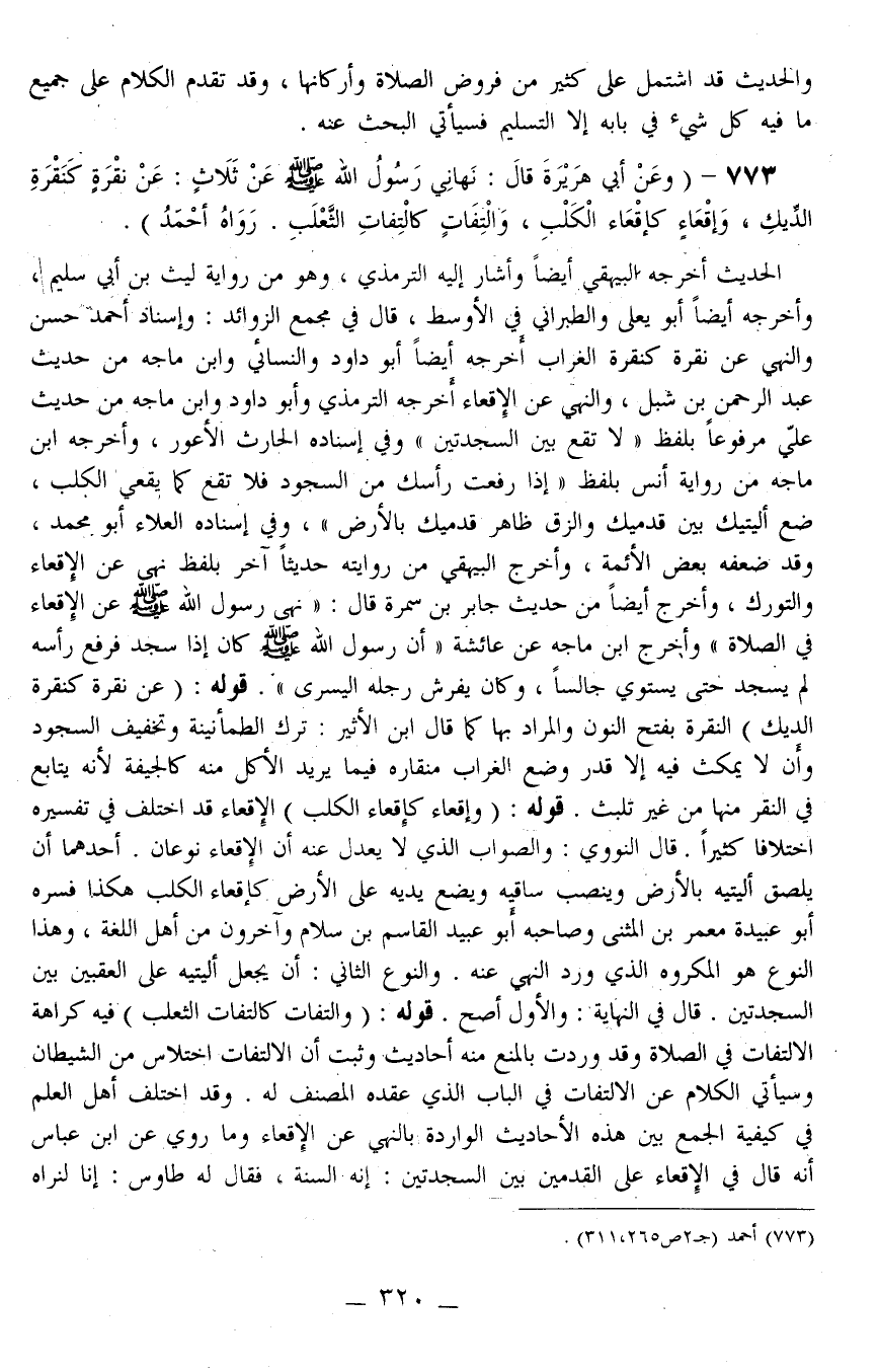 773 - (وَعَنْ «أَبِي هُرَيْرَةَ قَالَ: نَهَانِي رَسُولُ اللَّهِ - صَلَّى اللَّهُ عَلَيْهِ وَسَلَّمَ - عَنْ ثَلَاثٍ: عَنْ نَقْرَةٍ كَنَقْرَةِ الدِّيكِ، وَإِقْعَاءٍ كَإِقْعَاءِ الْكَلْبِ، وَالْتِفَاتٍ كَالْتِفَاتِ الثَّعْلَبِ.» رَوَاهُ أَحْمَدُ) .