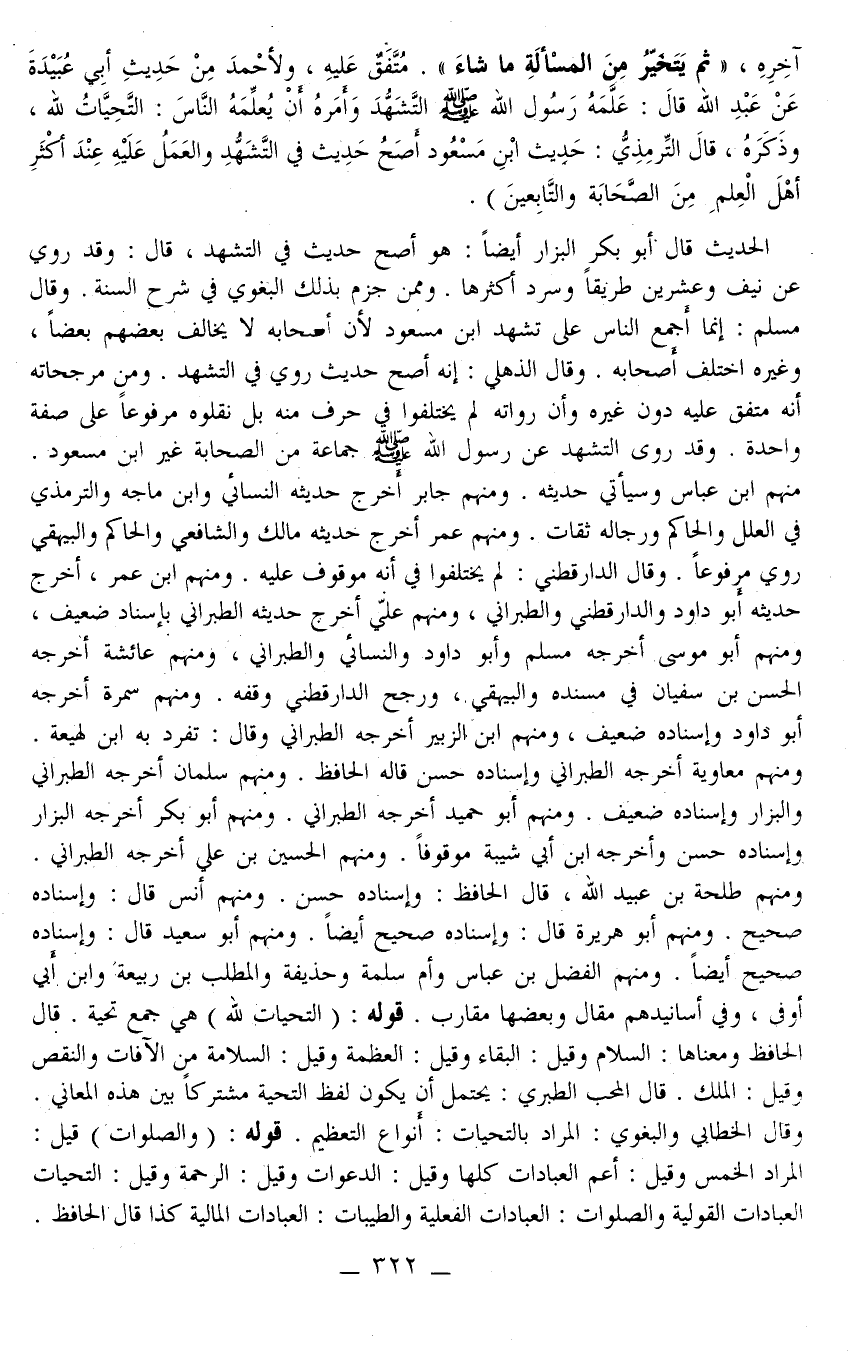 الْحَدِيثُ قَالَ أَبُو بَكْرٍ الْبَزَّارُ أَيْضًا: هُوَ أَصَحُّ حَدِيثٍ فِي التَّشَهُّدِ، قَالَ: وَقَدْ رُوِيَ عَنْ نَيِّفٍ وَعِشْرِينَ طَرِيقًا وَسَرَدَ أَكْثَرَهَا. وَمِمَّنْ جَزَمَ بِذَلِكَ الْبَغَوِيّ فِي شَرْحِ السُّنَّةِ. وَقَالَ مُسْلِمٌ: إنَّمَا أَجْمَعَ النَّاسُ عَلَى تَشَهُّدِ ابْنِ مَسْعُودٍ لِأَنَّ أَصْحَابَهُ لَا يُخَالِفُ بَعْضُهُمْ بَعْضًا، وَغَيْرُهُ اخْتَلَفَ أَصْحَابُهُ. وَقَالَ الذُّهْلِيُّ: إنَّهُ أَصَحُّ حَدِيثٍ رُوِيَ فِي التَّشَهُّدِ. وَمِنْ مُرَجَّحَاتِهِ أَنَّهُ مُتَّفَقٌ عَلَيْهِ دُونَ غَيْرِهِ وَأَنَّ رُوَاتَهُ لَمْ يَخْتَلِفُوا فِي حَرْفٍ مِنْهُ بَلْ نَقَلُوهُ مَرْفُوعًا عَلَى صِفَةٍ وَاحِدَةٍ. وَقَدْ رَوَى التَّشَهُّدَ عَنْ رَسُولِ اللَّهِ - صَلَّى اللَّهُ عَلَيْهِ وَسَلَّمَ - جَمَاعَةٌ مِنْ الصَّحَابَةِ غَيْرُ ابْنِ مَسْعُودٍ. مِنْهُمْ ابْنُ عَبَّاسٍ وَسَيَأْتِي حَدِيثُهُ. وَمِنْهُمْ جَابِرٌ أَخْرَجَ حَدِيثَهُ النَّسَائِيّ وَابْنُ مَاجَهْ وَالتِّرْمِذِيُّ فِي الْعِلَلِ وَالْحَاكِمُ وَرِجَالُهُ ثِقَاتٌ. وَمِنْهُمْ عُمَرُ أَخْرَجَ حَدِيثَهُ مَالِكٌ وَالشَّافِعِيُّ وَالْحَاكِمُ وَالْبَيْهَقِيُّ رُوِيَ مَرْفُوعًا. وَقَالَ الدَّارَقُطْنِيّ: لَمْ يَخْتَلِفُوا فِي أَنَّهُ مَوْقُوفٌ عَلَيْهِ وَمِنْهُمْ ابْنُ عُمَرَ، أَخْرَجَ حَدِيثَهُ أَبُو دَاوُد وَالدَّارَقُطْنِيّ وَالطَّبَرَانِيُّ، وَمِنْهُمْ عَلِيٌّ أَخْرَجَ حَدِيثَهُ الطَّبَرَانِيُّ بِإِسْنَادٍ ضَعِيفٍ، وَمِنْهُمْ أَبُو مُوسَى أَخْرَجَهُ مُسْلِمٌ وَأَبُو دَاوُد وَالنَّسَائِيُّ وَالطَّبَرَانِيُّ، وَمِنْهُمْ عَائِشَةُ أَخْرَجَهُ الْحَسَنُ بْنُ سُفْيَانَ فِي مُسْنَدِهِ وَالْبَيْهَقِيُّ، وَرَجَّحَ الدَّارَقُطْنِيّ وَقْفَهُ. وَمِنْهُمْ سَمُرَةُ أَخْرَجَهُ أَبُو دَاوُد وَإِسْنَادُهُ ضَعِيفٌ، وَمِنْهُمْ ابْنُ الزُّبَيْرِ أَخْرَجَهُ الطَّبَرَانِيُّ وَقَالَ: تَفَرَّدَ بِهِ ابْنُ لَهِيعَةَ. وَمِنْهُمْ مُعَاوِيَةُ أَخْرَجَهُ الطَّبَرَانِيُّ وَإِسْنَادُهُ حَسَنٌ قَالَهُ الْحَافِظُ. وَمِنْهُمْ سَلْمَانُ أَخْرَجَهُ الطَّبَرَانِيُّ وَالْبَزَّارُ وَإِسْنَادُهُ ضَعِيفٌ. وَمِنْهُمْ أَبُو حُمَيْدٍ أَخْرَجَهُ الطَّبَرَانِيُّ. وَمِنْهُمْ أَبُو بَكْرٍ أَخْرَجَهُ الْبَزَّارُ وَإِسْنَادُهُ حَسَنٌ وَأَخْرَجَهُ ابْنُ أَبِي شَيْبَةَ مَوْقُوفًا. وَمِنْهُمْ الْحُسَيْنُ بْنُ عَلِيٍّ أَخْرَجَهُ الطَّبَرَانِيُّ. وَمِنْهُمْ طَلْحَةُ بْنُ عُبَيْدِ اللَّهِ، قَالَ الْحَافِظُ: وَإِسْنَادُهُ حَسَنٌ وَمِنْهُمْ أَنَسٌ قَالَ: وَإِسْنَادُهُ صَحِيحٌ. وَمِنْهُمْ أَبُو هُرَيْرَةَ قَالَ: وَإِسْنَادُهُ صَحِيحٌ أَيْضًا. وَمِنْهُمْ أَبُو سَعِيدٍ قَالَ: وَإِسْنَادُهُ صَحِيحٌ أَيْضًا. وَمِنْهُمْ الْفَضْلُ بْنُ عَبَّاسٍ وَأُمُّ سَلَمَةَ وَحُذَيْفَةُ وَالْمُطَّلِبُ بْنُ رَبِيعَةَ وَابْنُ أَبِي أَوْفَى، وَفِي أَسَانِيدِهِمْ مَقَالٌ وَبَعْضُهَا مُقَارِبٌ. قَوْلُهُ: (التَّحِيَّاتُ لِلَّهِ) هِيَ جَمْعُ تَحِيَّةٍ. قَالَ الْحَافِظُ وَمَعْنَاهَا: السَّلَامُ وَقِيلَ: الْبَقَاءُ وَقِيلَ: الْعَظَمَةُ وَقِيلَ: السَّلَامَةُ مِنْ الْآفَاتِ وَالنَّقْصِ وَقِيلَ: الْمُلْكُ. قَالَ الْمُحِبُّ الطَّبَرِيُّ: يُحْتَمَلُ أَنْ يَكُونَ لَفْظُ التَّحِيَّةِ مُشْتَرَكًا بَيْنَ هَذِهِ الْمَعَانِي. وَقَالَ الْخَطَّابِيِّ وَالْبَغَوِيِّ: الْمُرَادُ بِالتَّحِيَّاتِ: أَنْوَاعُ التَّعْظِيمِ. قَوْلُهُ: (وَالصَّلَوَاتُ) قِيلَ: الْمُرَادُ الْخَمْسُ وَقِيلَ: أَعَمُّ الْعِبَادَاتِ كُلِّهَا وَقِيلَ: الدَّعَوَاتُ وَقِيلَ: الرَّحْمَةُ وَقِيلَ: التَّحِيَّاتُ: الْعِبَادَاتُ الْقَوْلِيَّةُ، وَالصَّلَوَاتُ: الْعِبَادَاتُ الْفِعْلِيَّةُ، وَالطَّيِّبَاتُ: 