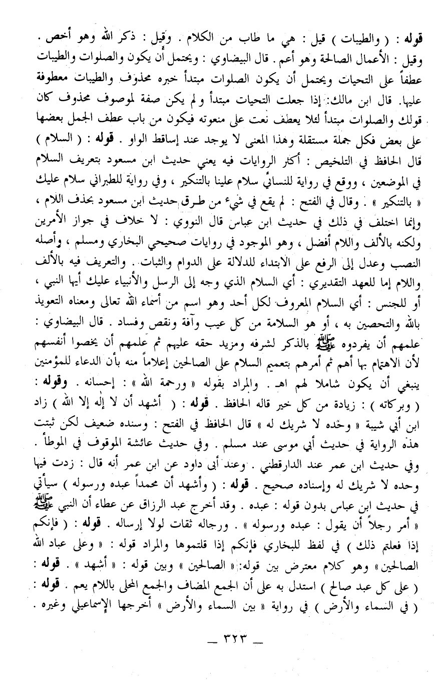 ـــــــــــــــــــــــــــــQقَوْلُهُ: (وَالطَّيِّبَاتُ) قِيلَ: هِيَ مَا طَابَ مِنْ الْكَلَامِ. وَقِيلَ: ذِكْرُ اللَّهِ وَهُوَ أَخَصُّ. وَقِيلَ: الْأَعْمَالُ الصَّالِحَةُ وَهُوَ أَعَمُّ. قَالَ الْبَيْضَاوِيُّ: وَيُحْتَمَلُ أَنْ يَكُونَ وَالصَّلَوَاتُ وَالطَّيِّبَاتُ عَطْفًا عَلَى التَّحِيَّاتِ وَيُحْتَمَلُ أَنْ يَكُونَ الصَّلَوَاتُ مُبْتَدَأً خَبَرُهُ مَحْذُوفٌ وَالطَّيِّبَاتُ مَعْطُوفَةٌ عَلَيْهَا. قَالَ ابْنُ مَالِكٍ: إذَا جَعَلْتَ التَّحِيَّاتِ مُبْتَدَأً وَلَمْ يَكُنْ صِفَةً لِمَوْصُوفٍ مَحْذُوفٍ كَانَ قَوْلُكَ وَالصَّلَوَاتُ مُبْتَدَأً لِئَلَّا يُعْطَفَ نَعْتٌ عَلَى مَنْعُوتِهِ فَيَكُونُ مِنْ بَابِ عَطْفِ الْجُمَلِ بَعْضِهَا عَلَى بَعْضٍ فَكُلُّ جُمْلَةٍ مُسْتَقِلَّةٍ وَهَذَا الْمَعْنَى لَا يُوجَدُ عِنْدَ إسْقَاطِ الْوَاوِ. قَوْلُهُ: (السَّلَامُ) قَالَ الْحَافِظُ فِي التَّلْخِيصِ: أَكْثَرُ الرِّوَايَاتِ فِيهِ. يَعْنِي حَدِيثَ ابْنِ مَسْعُودٍ بِتَعْرِيفِ السَّلَامِ فِي الْمَوْضِعَيْنِ، وَوَقَعَ فِي رِوَايَةٍ لِلنَّسَائِيِّ سَلَامٌ عَلَيْنَا بِالتَّنْكِيرِ، وَفِي رِوَايَةٍ لِلطَّبَرَانِيِّ سَلَامٌ عَلَيْكَ " بِالتَّنْكِيرِ "