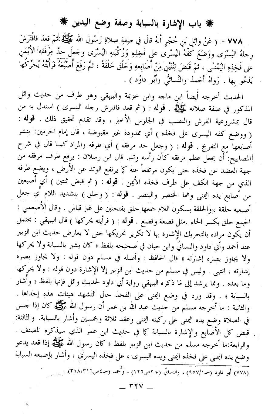 778 - (عَنْ وَائِلِ بْنِ حُجْرٍ أَنَّهُ قَالَ فِي صِفَةِ صَلَاةِ رَسُولِ اللَّهِ - صَلَّى اللَّهُ عَلَيْهِ وَسَلَّمَ -: «ثُمَّ قَعَدَ فَافْتَرَشَ رِجْلَهُ الْيُسْرَى وَوَضَعَ كَفَّهُ الْيُسْرَى عَلَى فَخِذِهِ وَرُكْبَتِهِ الْيُسْرَى وَجَعَلَ حَدَّ مِرْفَقِهِ الْأَيْمَنِ عَلَى فَخِذِهِ الْيُمْنَى، ثُمَّ قَبَضَ ثِنْتَيْنِ مِنْ أَصَابِعِهِ وَحَلَّقَ حَلْقَةً، ثُمَّ رَفَعَ أُصْبُعَهُ فَرَأَيْتُهُ يُحَرِّكُهَا يَدْعُو بِهَا» . رَوَاهُ أَحْمَدُ وَالنَّسَائِيُّ وَأَبُو دَاوُد)