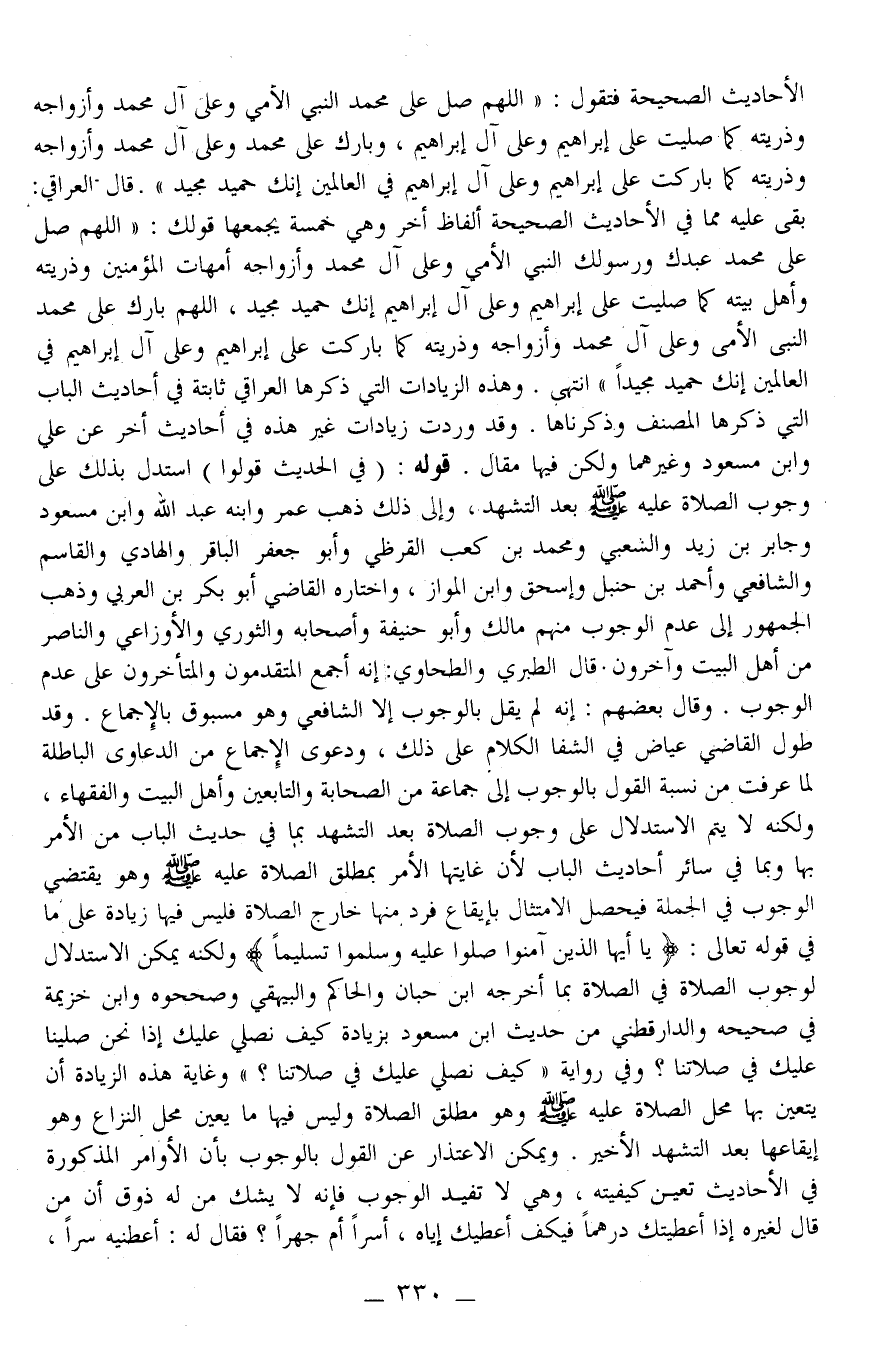 ـــــــــــــــــــــــــــــQفِي الْأَحَادِيثِ الصَّحِيحَةِ فَتَقُولُ: «اللَّهُمَّ صَلِّ عَلَى مُحَمَّدٍ النَّبِيِّ الْأُمِّيِّ وَعَلَى آلِ مُحَمَّدٍ وَأَزْوَاجِهِ وَذُرِّيَّتِهِ كَمَا صَلَّيْت عَلَى إبْرَاهِيمَ وَعَلَى آلِ إبْرَاهِيمَ، وَبَارِكْ عَلَى مُحَمَّدٍ وَعَلَى آلِ مُحَمَّدٍ وَأَزْوَاجِهِ وَذُرِّيَّتِهِ كَمَا بَارَكْت عَلَى إبْرَاهِيمَ وَعَلَى آلِ إبْرَاهِيمَ فِي الْعَالَمِينَ إنَّكَ حَمِيدٌ مَجِيدٌ» . قَالَ. الْعِرَاقِيُّ: بَقِيَ عَلَيْهِ مِمَّا فِي الْأَحَادِيثِ الصَّحِيحَةِ أَلْفَاظٌ أُخَرُ وَهِيَ خَمْسَةٌ يَجْمَعُهَا قَوْلُكَ: «اللَّهُمَّ صَلِّ عَلَى مُحَمَّدٍ عَبْدِك وَرَسُولِك النَّبِيِّ الْأُمِّيِّ وَعَلَى آلِ مُحَمَّدٍ وَأَزْوَاجِهِ أُمَّهَاتِ الْمُؤْمِنِينَ وَذُرِّيَّتِهِ وَأَهْلِ بَيْتِهِ كَمَا صَلَّيْتَ عَلَى إبْرَاهِيمَ وَعَلَى آلِ إبْرَاهِيمَ إنَّكَ حَمِيدٌ مَجِيدٌ، اللَّهُمَّ بَارِكْ عَلَى مُحَمَّدٍ النَّبِيِّ الْأُمِّيِّ وَعَلَى آلِ مُحَمَّدٍ وَأَزْوَاجِهِ وَذُرِّيَّتِهِ كَمَا بَارَكْت عَلَى إبْرَاهِيمَ وَعَلَى آلِ إبْرَاهِيمَ فِي الْعَالَمِينَ إنَّكَ حَمِيدٌ مَجِيدٌ» انْتَهَى وَهَذِهِ الزِّيَادَاتُ الَّتِي ذَكَرهَا الْعِرَاقِيُّ ثَابِتَةٌ فِي أَحَادِيثِ الْبَابِ الَّتِي ذَكَرَهَا الْمُصَنِّفُ وَذَكَرْنَاهَا. وَقَدْ وَرَدَتْ زِيَادَاتٌ غَيْرَ هَذِهِ فِي أَحَادِيثَ أُخَرَ عَنْ عَلِيٍّ وَابْنِ مَسْعُودٍ وَغَيْرِهِمَا وَلَكِنْ فِيهَا مَقَالٌ. قَوْلُهُ: (فِي الْحَدِيثِ قُولُوا) اُسْتُدِلَّ بِذَلِكَ عَلَى وُجُوبِ الصَّلَاةِ عَلَيْهِ - صَلَّى اللَّهُ عَلَيْهِ وَسَلَّمَ - بَعْد التَّشَهُّدِ، وَإِلَى ذَلِكَ ذَهَبَ عُمَرُ وَابْنُهُ عَبْدُ اللَّهِ وَابْنُ مَسْعُودٍ وَجَابِرُ بْنُ زَيْدٍ وَالشَّعْبِيُّ وَمُحَمَّدُ بْنُ كَعْبٍ الْقُرَظِيّ وَأَبُو جَعْفَرٍ الْبَاقِرُ وَالْهَادِي وَالْقَاسِمُ وَالشَّافِعِيُّ وَأَحْمَدُ بْنُ حَنْبَلٍ وَإِسْحَاقُ وَابْنُ الْمَوَّازِ، وَاخْتَارَهُ الْقَاضِي أَبُو بَكْرٍ بْنُ الْعَرَبِيِّ وَذَهَبَ الْجُمْهُورُ إلَى عَدَمِ الْوُجُوبِ مِنْهُمْ مَالِكٌ وَأَبُو حَنِيفَةَ وَأَصْحَابُهُ وَالثَّوْرِيُّ وَالْأَوْزَاعِيُّ وَالنَّاصِرُ مِنْ أَهْلِ الْبَيْتِ وَآخَرُونَ قَالَ الطَّبَرِيُّ وَالطَّحَاوِيُّ: إنَّهُ أَجْمَعَ الْمُتَقَدِّمُونَ وَالْمُتَأَخِّرُونَ عَلَى عَدَمِ الْوُجُوبِ