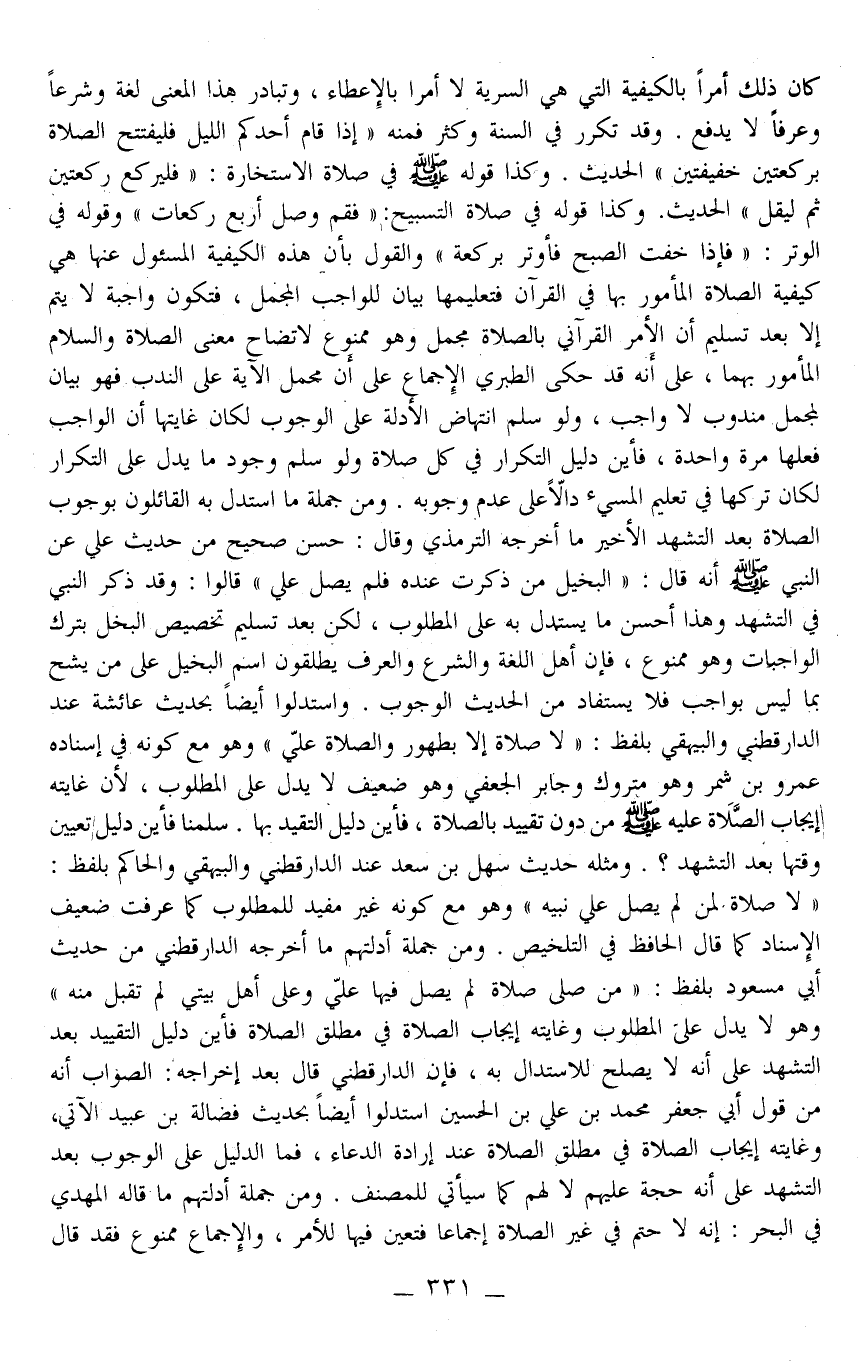 وَكَذَا «قَوْلُهُ فِي صَلَاةِ التَّسْبِيحِ: فَقُمْ وَصَلِّ أَرْبَعَ رَكَعَاتٍ» «وَقَوْلُهُ فِي الْوِتْرِ: فَإِذَا خِفْت الصُّبْحَ فَأَوْتِرْ بِرَكْعَةٍ» وَالْقَوْلُ بِأَنَّ هَذِهِ الْكَيْفِيَّةَ الْمَسْئُولَ عَنْهَا هِيَ كَيْفِيَّةِ الصَّلَاةِ الْمَأْمُورِ بِهَا فِي الْقُرْآنِ فَتَعْلِيمُهَا بَيَانٌ لِلْوَاجِبِ الْمُجْمَلِ، فَتَكُونُ وَاجِبَةً لَا يَتِمُّ إلَّا بَعْدَ تَسْلِيمِ أَنَّ الْأَمْرَ الْقُرْآنِيَّ بِالصَّلَاةِ مُجْمَلٌ وَهُوَ مَمْنُوعٌ لِاتِّضَاحِ مَعْنَى الصَّلَاةِ وَالسَّلَامِ الْمَأْمُورِ بِهِمَا، عَلَى أَنَّهُ قَدْ حَكَى الطَّبَرِيُّ الْإِجْمَاعَ عَلَى أَنَّ مَحْمَلَ الْآيَةِ عَلَى النَّدْبِ فَهُوَ بَيَانٌ لِمُجْمَلٍ مَنْدُوبٍ لَا وَاجِبَ، وَلَوْ سَلِمَ انْتِهَاضُ الْأَدِلَّةِ عَلَى الْوُجُوبِ لَكَانَ غَايَتُهَا أَنَّ الْوَاجِبَ فِعْلُهَا مَرَّةً وَاحِدَةً، فَأَيْنَ دَلِيلُ التَّكْرَارِ فِي كُلِّ صَلَاةٍ وَلَوْ سَلِمَ وُجُودُ مَا يَدُلُّ عَلَى التَّكْرَارِ لَكَانَ تَرْكُهَا فِي تَعْلِيمِ الْمُسِيءِ دَالًا عَلَى عَدَمِ وُجُوبِهِ