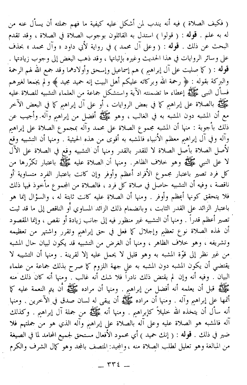 وَأُجِيبُ عَنْ ذَلِكَ بِأَجْوِبَةٍ: مِنْهَا أَنَّ الْمُشَبَّهَ مَجْمُوعُ الصَّلَاةِ عَلَى مُحَمَّدٍ وَآلِهِ بِمَجْمُوعِ الصَّلَاةِ عَلَى إبْرَاهِيمَ وَآلِهِ وَفِي آلِ إبْرَاهِيمَ مُعْظَمُ الْأَنْبِيَاءِ فَالْمُشَبَّهُ بِهِ أَقْوَى مِنْ هَذِهِ الْحَيْثِيَّةِ. وَمِنْهَا أَنَّ التَّشْبِيهَ وَقَعَ لِأَصْلِ الصَّلَاةِ بِأَصْلِ الصَّلَاةِ لَا لِلْقَدْرِ بِالْقَدْرِ وَمِنْهَا أَنَّ التَّشْبِيهَ وَقَعَ فِي الصَّلَاةِ عَلَى الْآلِ لَا عَلَى النَّبِيِّ - صَلَّى اللَّهُ عَلَيْهِ وَسَلَّمَ - وَهُوَ خِلَافُ الظَّاهِرِ. وَمِنْهَا أَنَّ الصَّلَاةَ عَلَيْهِ - صَلَّى اللَّهُ عَلَيْهِ وَسَلَّمَ - بِاعْتِبَارِ تَكَرُّرِهَا مِنْ كُلِّ فَرْدٍ تَصِيرُ بِاعْتِبَارِ مَجْمُوعِ الْأَفْرَادِ أَعْظَمَ وَأَوْفَرَ وَإِنْ كَانَتْ بِاعْتِبَارِ الْفَرْدِ مُتَسَاوِيَةً أَوْ نَاقِصَةً، وَفِيهِ أَنَّ التَّشْبِيهَ حَاصِلٌ فِي صَلَاةِ كُلِّ فَرْدٍ، فَالصَّلَاةُ مِنْ الْمَجْمُوعِ مَأْخُوذٌ فِيهَا ذَلِكَ فَلَا يَتَحَقَّقُ كَوْنُهَا أَعْظَمَ وَأَوْفَرَ