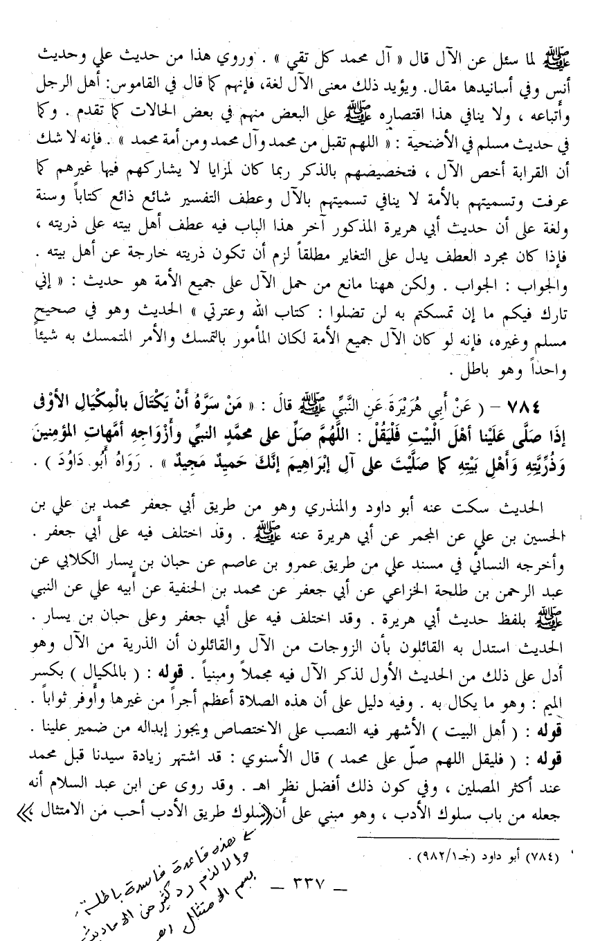 784 - (عَنْ أَبِي هُرَيْرَةَ عَنْ النَّبِيِّ - صَلَّى اللَّهُ عَلَيْهِ وَسَلَّمَ - قَالَ: «مَنْ سَرَّهُ أَنْ يَكْتَالَ بِالْمِكْيَالِ الْأَوْفَى إذَا صَلَّى عَلَيْنَا أَهْلَ الْبَيْتِ فَلْيَقُلْ: اللَّهُمَّ صَلِّ عَلَى مُحَمَّدٍ النَّبِيِّ وَأَزْوَاجِهِ أُمَّهَاتِ الْمُؤْمِنِينَ وَذُرِّيَّتِهِ وَأَهْلِ بَيْتِهِ كَمَا صَلَّيْتَ عَلَى آلِ إبْرَاهِيمَ إنَّكَ حَمِيدٌ مَجِيدٌ» . رَوَاهُ أَبُو دَاوُد)