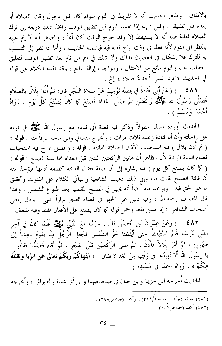 481 - ( «وَعَنْ أَبِي قَتَادَةَ فِي قِصَّةِ نَوْمِهِمْ عَنْ صَلَاةِ الْفَجْرِ قَالَ: ثُمَّ أَذَّنَ بِلَالٌ بِالصَّلَاةِ فَصَلَّى رَسُولُ اللَّهِ - صَلَّى اللَّهُ عَلَيْهِ وَسَلَّمَ - رَكْعَتَيْنِ ثُمَّ صَلَّى الْغَدَاةَ فَصَنَعَ كَمَا كَانَ يَصْنَعُ كُلَّ يَوْمٍ» . رَوَاهُ أَحْمَدُ وَمُسْلِمٌ) . الْحَدِيثُ أَوْرَدَهُ مُسْلِمٌ مُطَوَّلًا وَذَكَرَ فِيهِ قِصَّةُ أَبِي قَتَادَةَ مَعَ رَسُولِ اللَّهِ - صَلَّى اللَّهُ عَلَيْهِ وَسَلَّمَ - فِي نَوْمِهِ عَلَى رَاحِلَتِهِ وَأَنَّ أَبَا قَتَادَةَ زَعَمَهُ ثَلَاثَ مَرَّاتٍ، وَأَخْرَجَ النَّسَائِيّ وَابْنُ مَاجَهْ طَرَفًا مِنْهُ.