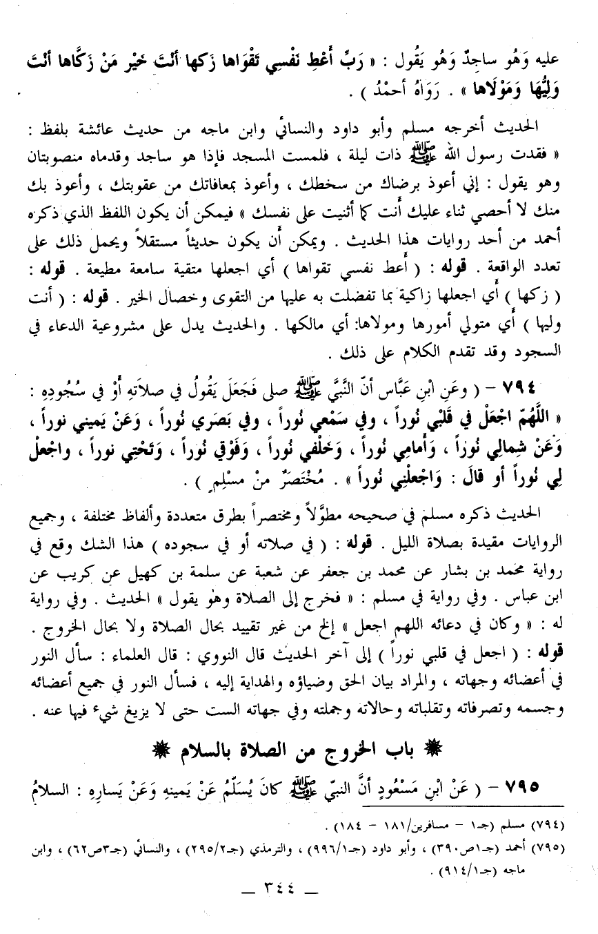 794 - (وَعَنْ ابْنِ عَبَّاسٍ «أَنَّ النَّبِيَّ - صَلَّى اللَّهُ عَلَيْهِ وَسَلَّمَ - صَلَّى فَجَعَلَ يَقُولُ فِي صَلَاتِهِ أَوْ فِي سُجُودِهِ: اللَّهُمَّ اجْعَلْ فِي قَلْبِي نُورًا، وَفِي سَمْعِي نُورًا، وَفِي بَصَرِي نُورًا، وَعَنْ يَمِينِي نُورًا، وَعَنْ شِمَالِي نُورًا، وَأَمَامِي نُورًا، وَخَلْفِي نُورًا، وَفَوْقِي نُورًا، وَتَحْتِي نُورًا، وَاجْعَلْ لِي نُورًا أَوْ قَالَ: وَاجْعَلْنِي نُورًا» . مُخْتَصَرٌ مِنْ مُسْلِمٍ) . الْحَدِيثُ ذَكَرَهُ مُسْلِمٌ فِي صَحِيحِهِ مُطَوَّلًا وَمُخْتَصَرًا بِطُرُقٍ مُتَعَدِّدَةٍ وَأَلْفَاظٍ مُخْتَلِفَةٍ، وَجَمِيعُ الرِّوَايَاتِ مُقَيَّدَةٌ بِصَلَاةِ اللَّيْلِ