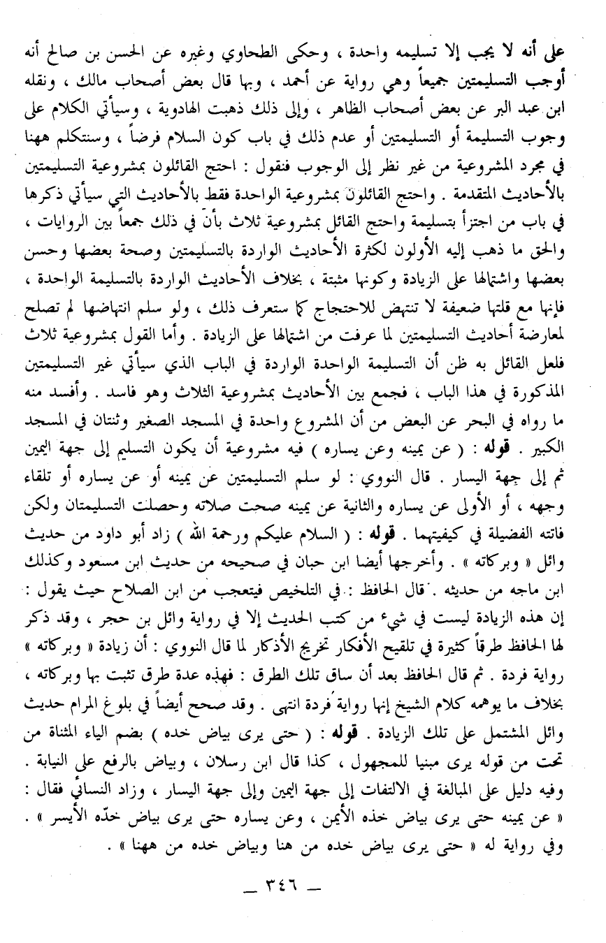 ـــــــــــــــــــــــــــــQعَلَى أَنَّهُ لَا يَجِبُ إلَّا تَسْلِيمَةٌ وَاحِدَةٌ، وَحَكَى الطَّحَاوِيُّ وَغَيْرُهُ عَنْ الْحَسَنِ بْنِ صَالِحٍ أَنَّهُ أَوْجَبَ التَّسْلِيمَتَيْنِ جَمِيعًا وَهِيَ رِوَايَةٌ عَنْ أَحْمَدَ، وَبِهَا قَالَ بَعْضُ أَصْحَابِ مَالِكٍ، وَنَقَلَهُ ابْنُ عَبْدِ الْبَرِّ عَنْ بَعْضِ أَصْحَابِ الظَّاهِرِ، وَإِلَى ذَلِكَ ذَهَبَتْ الْهَادَوِيَّةُ، وَسَيَأْتِي الْكَلَامُ عَلَى وُجُوبِ التَّسْلِيمَةِ أَوْ التَّسْلِيمَتَيْنِ أَوْ عَدَمِ ذَلِكَ فِي بَابِ كَوْنِ السَّلَامِ فَرْضًا، وَسَنَتَكَلَّمُ هَهُنَا فِي مُجَرَّدِ الْمَشْرُوعِيَّةِ مِنْ غَيْرِ نَظَرٍ إلَى الْوُجُوبِ فَنَقُولُ: احْتَجَّ الْقَائِلُونَ بِمَشْرُوعِيَّةِ التَّسْلِيمَتَيْنِ بِالْأَحَادِيثِ الْمُتَقَدِّمَةِ