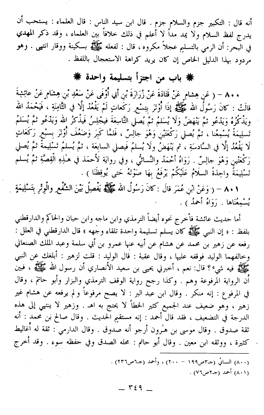 800 - (عَنْ هِشَامٍ عَنْ قَتَادَةَ عَنْ زُرَارَةَ بْنِ أَبِي أَوْفَى عَنْ سَعْدِ بْنِ هِشَامٍ عَنْ عَائِشَةَ قَالَتْ: «كَانَ رَسُولُ اللَّهِ - صَلَّى اللَّهُ عَلَيْهِ وَسَلَّمَ - إذَا أَوْتَرَ بِتِسْعِ رَكَعَاتٍ لَمْ يَقْعُدْ إلَّا فِي الثَّامِنَةِ، فَيَحْمَدُ اللَّهَ وَيَذْكُرُهُ وَيَدْعُو ثُمَّ يَنْهَضُ وَلَا يُسَلِّمُ ثُمَّ يُصَلِّي التَّاسِعَةَ فَيَجْلِسُ فَيَذْكُرُ اللَّهَ وَيَدْعُو ثُمَّ يُسَلِّمُ تَسْلِيمَةً يُسْمِعُنَا، ثُمَّ يُصَلِّي رَكْعَتَيْنِ وَهُوَ جَالِسٌ، فَلَمَّا كَبُرَ وَضَعُفَ أَوْتَرَ بِسَبْعِ رَكَعَاتٍ لَا يَقْعُدُ إلَّا فِي السَّادِسَةِ، ثُمَّ يَنْهَضُ وَلَا يُسَلِّمُ فَيُصَلِّي السَّابِعَةَ، ثُمَّ يُسَلِّمُ تَسْلِيمَةً ثُمَّ يُصَلِّي رَكْعَتَيْنِ وَهُوَ جَالِسٌ» . رَوَاهُ أَحْمَدُ وَالنَّسَائِيُّ، وَفِي رِوَايَةٍ لِأَحْمَدَ فِي هَذِهِ الْقِصَّةِ «ثُمَّ يُسَلِّمُ تَسْلِيمَةً وَاحِدَةً السَّلَامُ عَلَيْكُمْ يَرْفَعُ بِهَا صَوْتَهُ حَتَّى يُوقِظَنَا» .