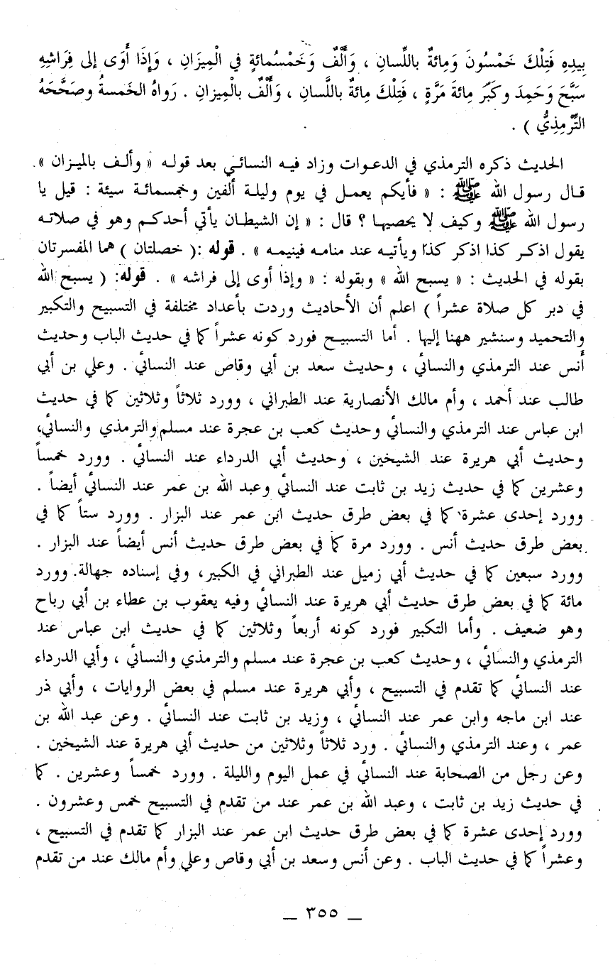 بِيَدِهِ فَتِلْكَ خَمْسُونَ وَمِائَةٌ بِاللِّسَانِ، وَأَلْفٌ وَخَمْسُمِائَةٍ فِي الْمِيزَانِ، وَإِذَا أَوَى إلَى فِرَاشِهِ سَبَّحَ وَحَمِدَ وَكَبَّرَ مِائَةَ مَرَّةٍ، فَتِلْكَ مِائَةٌ بِاللِّسَانِ، وَأَلْفٌ بِالْمِيزَانِ رَوَاهُ الْخَمْسَةُ وَصَحَّحَهُ التِّرْمِذِيُّ)