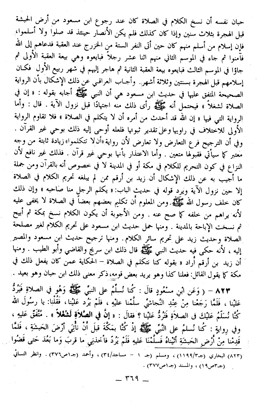 823 - (وَعَنْ ابْنِ مَسْعُودٍ قَالَ: «كُنَّا نُسَلِّمُ عَلَى النَّبِيِّ - صَلَّى اللَّهُ عَلَيْهِ وَسَلَّمَ - وَهُوَ فِي الصَّلَاةِ فَيَرُدُّ عَلَيْنَا، فَلَمَّا رَجَعْنَا مِنْ عِنْدِ النَّجَاشِيِّ سَلَّمْنَا عَلَيْهِ، فَلَمْ يَرُدَّ عَلَيْنَا، فَقُلْنَا: يَا رَسُولَ اللَّهِ كُنَّا نُسَلِّمُ عَلَيْك فِي الصَّلَاةِ فَتَرُدُّ عَلَيْنَا؟ فَقَالَ: إنَّ فِي الصَّلَاةِ لَشُغْلًا» . مُتَّفَقٌ عَلَيْهِ وَفِي رِوَايَةٍ: «كُنَّا نُسَلِّمُ عَلَى النَّبِيِّ - صَلَّى اللَّهُ عَلَيْهِ وَسَلَّمَ - إذْ كُنَّا بِمَكَّةَ قَبْلَ أَنْ نَأْتِيَ أَرْضَ الْحَبَشَةِ، فَلَمَّا قَدِمْنَا مِنْ أَرْضِ الْحَبَشَةِ أَتَيْنَاهُ فَسَلَّمْنَا عَلَيْهِ فَلَمْ يَرُدَّ فَأَخَذَنِي مَا قَرُبَ وَمَا بَعُدَ حَتَّى قَضَوْا الصَّلَاةَ، فَسَأَلْته فَقَالَ: إنَّ اللَّهَ يُحْدِثُ مِنْ أَمْرِهِ مَا يَشَاءُ وَإِنَّهُ قَدْ أَحْدَثَ مِنْ أَمْرِهِ أَنْ لَا نَتَكَلَّمَ فِي الصَّلَاةِ» . رَوَاهُ أَحْمَدُ وَالنَّسَائِيُّ) .
