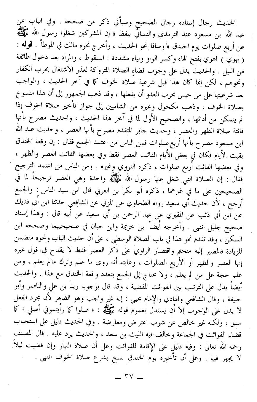 فَمِنْ النَّاسِ مَنْ اعْتَمَدَ الْجَمْعَ فَقَالَ: إنَّ وَقْعَةَ الْخَنْدَقِ بَقِيَتْ لِأَيَّامٍ فَكَانَ بَعْضُ الْأَيَّامِ الْفَائِتُ الْعَصْرُ فَقَطْ وَفِي بَعْضِهَا الْفَائِتُ الْعَصْرُ وَالظُّهْرُ، وَفِي بَعْضِهَا الْفَائِتُ أَرْبَعُ صَلَوَاتٍ، ذَكَرَهُ النَّوَوِيُّ وَغَيْرُهُ. وَمِنْ النَّاسِ مَنْ اعْتَمَدَ التَّرْجِيحَ فَقَالَ: إنَّ الصَّلَاةَ الَّتِي شُغِلَ عَنْهَا رَسُولُ اللَّهِ - صَلَّى اللَّهُ عَلَيْهِ وَسَلَّمَ - وَاحِدَةٌ وَهِيَ الْعَصْرُ تَرْجِيحًا لِمَا فِي الصَّحِيحَيْنِ عَلَى مَا فِي غَيْرِهِمَا، ذَكَرَهُ أَبُو بَكْرِ بْنُ الْعَرَبِيِّ قَالَ ابْنُ سَيِّدِ النَّاسِ: وَالْجَمْعُ أَرْجَحُ، لِأَنَّ حَدِيثَ أَبِي سَعِيدٍ رَوَاهُ الطَّحَاوِيُّ عَنْ الْمُزَنِيّ عَنْ الشَّافِعِيِّ حَدَّثَنَا ابْنُ أَبِي فُدَيْكٍ عَنْ ابْنِ أَبِي ذِئْبٍ عَنْ الْمَقْبُرِيِّ عَنْ عَبْدِ الرَّحْمَنِ بْنِ أَبِي سَعِيدٍ عَنْ أَبِيهِ قَالَ: وَهَذَا إسْنَادٌ صَحِيحٌ جَلِيلٌ انْتَهَى. وَأَخْرَجَهُ أَيْضًا ابْنُ خُزَيْمَةَ وَابْنُ حِبَّانَ فِي صَحِيحَيْهِمَا وَصَحَّحَهُ ابْنُ السَّكَنِ، وَقَدْ تَقَدَّمَ نَحْوُ هَذَا فِي بَابِ الصَّلَاةِ الْوُسْطَى، عَلَى أَنَّ حَدِيثَ الْبَابِ وَنَحْوَهُ مُتَضَمِّنٌ لِلزِّيَادَةِ فَالْمَصِيرُ إلَيْهِ مُتَحَتِّمٌ وَاقْتِصَارُ الرَّاوِي عَلَى ذِكْرِ الْعَصْرِ فَقَطْ لَا يَقْدَحُ فِي قَوْلِ غَيْرِهِ إنَّهَا الْعَصْرُ وَالظُّهْرُ أَوْ الْأَرْبَعُ الصَّلَوَاتِ، وَغَايَتُهُ أَنَّهُ رَوَى مَا عَلِمَ وَتَرَكَ مَا لَمْ يَعْلَمْ، وَمَنْ عَلِمَ حُجَّةٌ عَلَى مَنْ لَمْ يَعْلَمْ، وَلَا يُحْتَاجُ إلَى الْجَمْعِ بِتَعَدُّدِ وَاقِعَةِ الْخَنْدَقِ مَعَ هَذَا. وَالْحَدِيثُ أَيْضًا يَدُلُّ عَلَى التَّرْتِيبِ بَيْنَ الْفَوَائِتِ الْمَقْضِيَّةِ، وَقَدْ قَالَ بِوُجُوبِهِ زَيْدُ بْنُ عَلِيٍّ وَالنَّاصِرُ وَأَبُو حَنِيفَةَ، وَقَالَ الشَّافِعِيُّ وَالْهَادِي وَالْإِمَامُ يَحْيَى إنَّهُ غَيْرُ وَاجِبٍ وَهُوَ الظَّاهِرُ لِأَنَّ مُجَرَّدَ الْفِعْلِ لَا يَدُلُّ عَلَى الْوُجُوبِ إلَّا أَنْ يُسْتَدَلَّ بِعُمُومِ قَوْلِهِ - صَلَّى اللَّهُ عَلَيْهِ وَسَلَّمَ -: «صَلُّوا كَمَا رَأَيْتُمُونِي أُصَلِّي» كَمَا سَبَقَ، وَلَكِنَّهُ غَيْرُ خَالِصٍ عَنْ شَوْبِ اعْتِرَاضٍ وَمُعَارَضَةٍ.