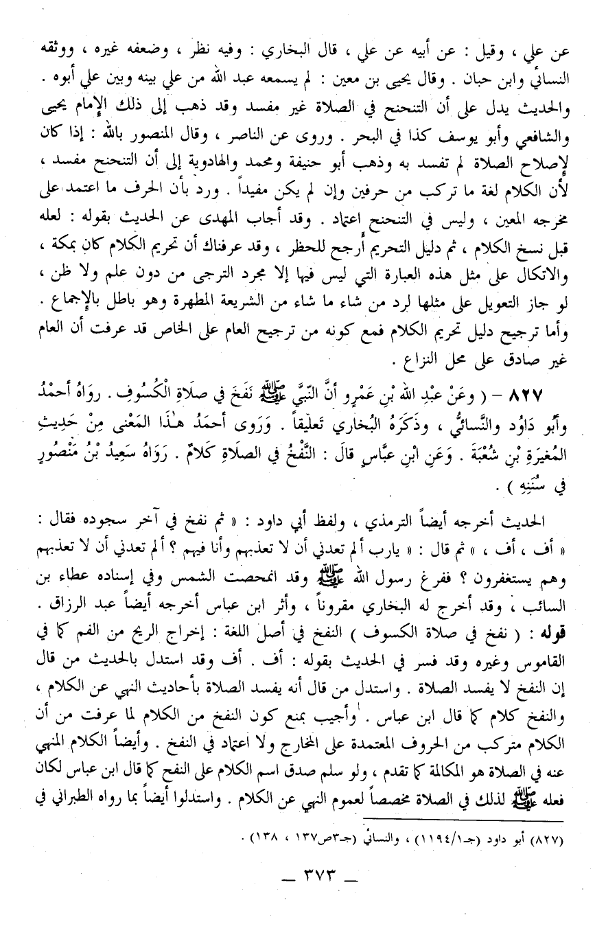 827 - (وَعَنْ عَبْدِ اللَّهِ بْنِ عَمْرٍو «أَنَّ النَّبِيَّ - صَلَّى اللَّهُ عَلَيْهِ وَسَلَّمَ - نَفَخَ فِي صَلَاةِ الْكُسُوفِ» . رَوَاهُ أَحْمَدُ وَأَبُو دَاوُد وَالنَّسَائِيُّ، وَذَكَرَهُ الْبُخَارِيُّ تَعْلِيقًا. وَرَوَى أَحْمَدُ هَذَا الْمَعْنَى مِنْ حَدِيثِ الْمُغِيرَةِ بْنِ شُعْبَةَ. وَعَنْ ابْنِ عَبَّاسٍ قَالَ: النَّفْخُ فِي الصَّلَاةِ كَلَامٌ. رَوَاهُ سَعِيدُ بْنُ مَنْصُورٍ فِي سُنَنِهِ) .