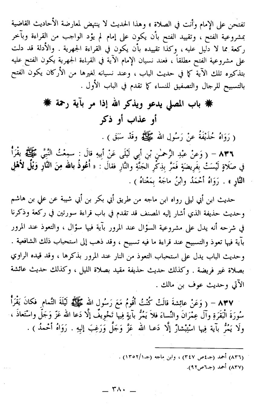 836 - (وَعَنْ عَبْدِ الرَّحْمَنِ بْنِ أَبِي لَيْلَى عَنْ أَبِيهِ قَالَ: «سَمِعْت النَّبِيَّ - صَلَّى اللَّهُ عَلَيْهِ وَسَلَّمَ - يَقْرَأُ فِي صَلَاةٍ لَيْسَتْ بِفَرِيضَةٍ فَمَرَّ بِذِكْرِ الْجَنَّةِ وَالنَّارِ فَقَالَ: أَعُوذُ بِاَللَّهِ مِنْ النَّارِ وَيْلٌ لِأَهْلِ النَّارِ» . رَوَاهُ أَحْمَدُ وَابْنُ مَاجَهْ بِمَعْنَاهُ)