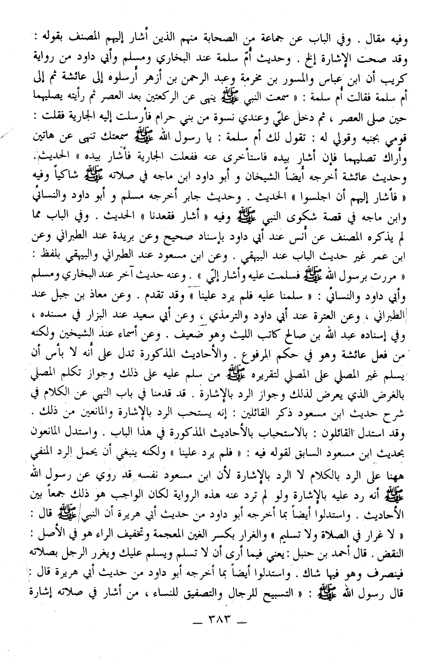 وَقَدْ اسْتَدَلَّ الْقَائِلُونَ: بِالِاسْتِحْبَابِ بِالْأَحَادِيثِ الْمَذْكُورَةِ فِي هَذَا الْبَابِ. وَاسْتَدَلَّ الْمَانِعُونَ بِحَدِيثِ ابْنِ مَسْعُودٍ السَّابِقِ لِقَوْلِهِ فِيهِ: " فَلَمْ يَرُدَّ عَلَيْنَا " وَلَكِنَّهُ يَنْبَغِي أَنْ يُحْمَلَ الرَّدُّ الْمَنْفِيُّ هَهُنَا عَلَى الرَّدِّ بِالْكَلَامِ لَا الرَّدِّ بِالْإِشَارَةِ لِأَنَّ ابْنَ مَسْعُودٍ نَفْسَهُ قَدْ رَوَى عَنْ رَسُولِ اللَّهِ - صَلَّى اللَّهُ عَلَيْهِ وَسَلَّمَ - أَنَّهُ رَدَّ عَلَيْهِ بِالْإِشَارَةِ وَلَوْ لَمْ تَرِدْ عَنْهُ هَذِهِ الرِّوَايَةُ لَكَانَ الْوَاجِبُ هُوَ ذَلِكَ جَمْعًا بَيْنَ الْأَحَادِيثِ