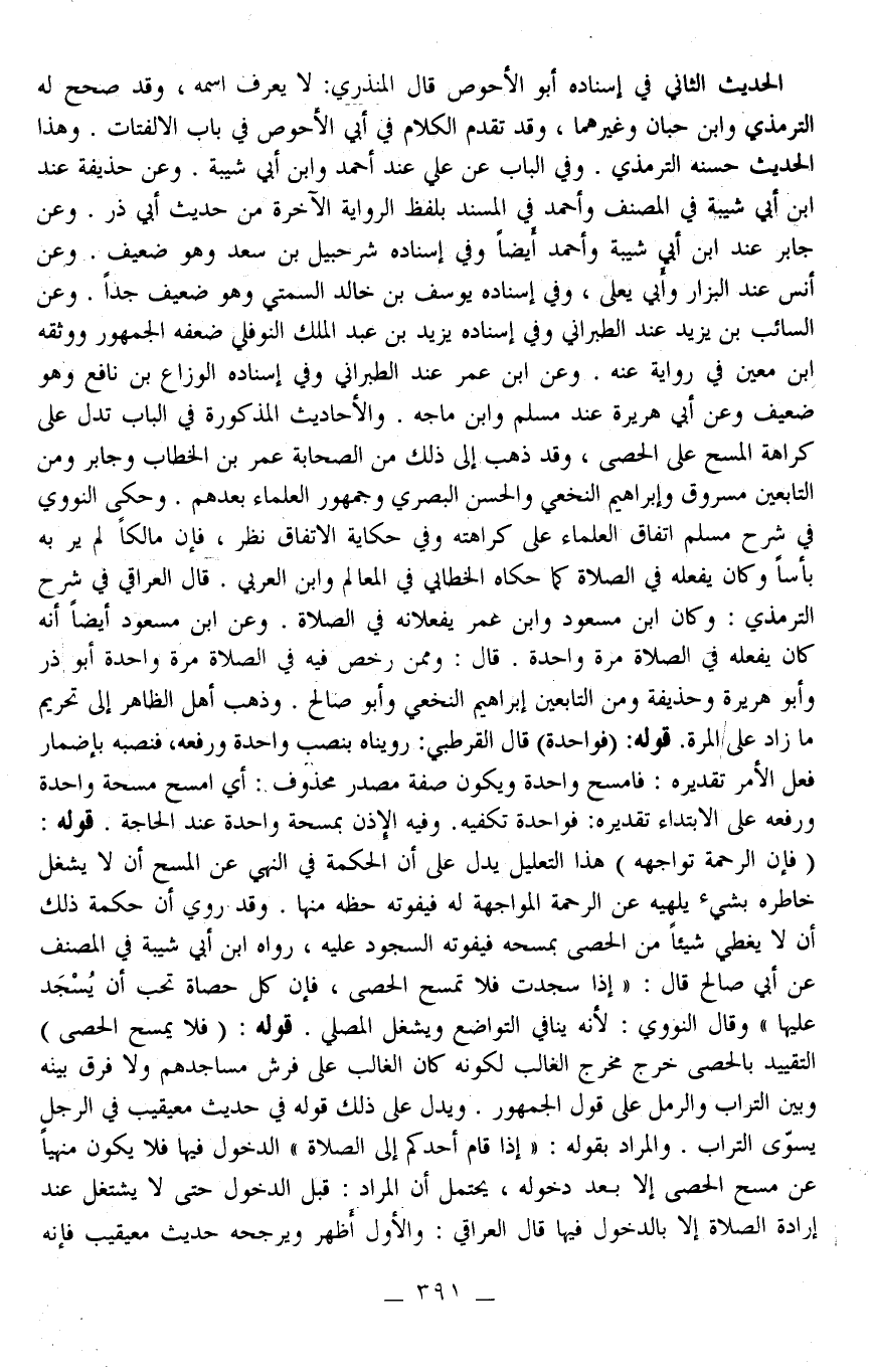 الْحَدِيثُ الثَّانِي فِي إسْنَادِهِ أَبُو الْأَحْوَصِ قَالَ الْمُنْذِرِيُّ: لَا يُعْرَفُ اسْمُهُ، وَقَدْ صَحَّحَ لَهُ التِّرْمِذِيُّ وَابْنُ حِبَّانَ وَغَيْرُهُمَا، وَقَدْ تَقَدَّمَ الْكَلَامُ فِي أَبِي الْأَحْوَصِ فِي بَابِ الِالْتِفَاتِ. وَهَذَا الْحَدِيثُ حَسَّنَهُ التِّرْمِذِيُّ وَفِي الْبَابِ عَنْ عَلِيٍّ عِنْدَ أَحْمَدَ وَابْنِ أَبِي شَيْبَةَ وَعَنْ حُذَيْفَةَ عِنْدَ ابْنِ أَبِي شَيْبَةَ فِي الْمُصَنَّفِ وَأَحْمَدَ فِي الْمُسْنَدِ بِلَفْظِ الرِّوَايَةِ الْآخِرَةِ مِنْ حَدِيثِ أَبِي ذَرٍّ وَعَنْ جَابِرٍ عِنْدَ ابْنِ أَبِي شَيْبَةَ وَأَحْمَدَ أَيْضًا وَفِي إسْنَادِهِ شُرَحْبِيلُ بْنُ سَعْدٍ وَهُوَ ضَعِيفٌ وَعَنْ أَنَسٍ عِنْدَ الْبَزَّارِ وَأَبِي يَعْلَى، وَفِي إسْنَادِهِ يُوسُفُ بْنُ خَالِدٍ السَّمْتِيُّ وَهُوَ ضَعِيفٌ جِدًّا وَعَنْ السَّائِبِ بْنِ يَزِيدَ عِنْدَ الطَّبَرَانِيِّ وَفِي إسْنَادِهِ يَزِيدُ بْنِ عَبْدِ الْمَلِكِ النَّوْفَلِيُّ ضَعَّفَهُ الْجُمْهُورُ وَوَثَّقَهُ ابْنُ مَعِينٍ فِي رِوَايَةٍ عَنْهُ وَعَنْ ابْنِ عُمَرَ عِنْدَ الطَّبَرَانِيُّ وَفِي إسْنَادِهِ الْوَزَّاعُ بْنُ نَافِعٍ وَهُوَ ضَعِيفٌ وَعَنْ أَبِي هُرَيْرَةَ عِنْدَ مُسْلِمٍ وَابْنِ مَاجَهْ وَالْأَحَادِيثُ الْمَذْكُورَةُ فِي الْبَابِ تَدُلُّ عَلَى كَرَاهَةِ الْمَسْحِ عَلَى الْحَصَى، وَقَدْ ذَهَبَ إلَى ذَلِكَ مِنْ الصَّحَابَةِ عُمَرُ بْنُ الْخَطَّابِ وَجَابِرٌ وَمِنْ التَّابِعِينَ مَسْرُوقٌ وَإِبْرَاهِيمُ النَّخَعِيّ وَالْحَسَنُ الْبَصْرِيُّ وَجُمْهُورُ الْعُلَمَاءِ بَعْدَهُمْ