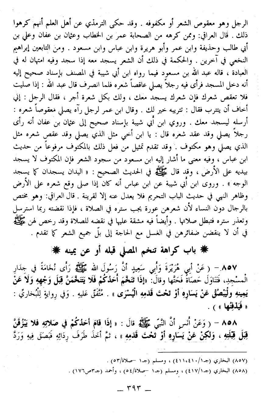 ـــــــــــــــــــــــــــــQالرَّجُلِ وَهُوَ مَعْقُوصُ الشَّعْرِ أَوْ مَكْفُوفُهُ. وَقَدْ حَكَى التِّرْمِذِيُّ عَنْ أَهْلِ الْعِلْمِ أَنَّهُمْ كَرِهُوا ذَلِكَ. قَالَ الْعِرَاقِيُّ: وَمِمَّنْ كَرِهَهُ مِنْ الصَّحَابَةِ عُمَرُ بْنُ الْخَطَّابِ وَعُثْمَانُ بْنُ عَفَّانَ وَعَلِيُّ بْنُ أَبِي طَالِبٍ وَحُذَيْفَةُ وَابْنُ عُمَرَ وَأَبُو هُرَيْرَةَ وَابْنُ عَبَّاسٍ وَابْنُ مَسْعُودٍ. وَمِنْ التَّابِعِينَ إبْرَاهِيمُ النَّخَعِيّ فِي آخَرِينَ. وَالْحِكْمَةُ فِي ذَلِكَ أَنَّ الشَّعْرَ يَسْجُدُ مَعَهُ إذَا سَجَدَ وَفِيهِ امْتِهَانٌ لَهُ فِي الْعِبَادَةِ، قَالَهُ عَبْدُ اللَّهِ بْنُ مَسْعُودٍ فِيمَا رَوَاهُ ابْنُ أَبِي شَيْبَةَ فِي الْمُصَنَّفِ بِإِسْنَادٍ صَحِيحٍ إلَيْهِ أَنَّهُ دَخَلَ الْمَسْجِدَ فَرَأَى فِيهِ رَجُلًا يُصَلِّي عَاقِصًا شَعْرَهُ فَلَمَّا انْصَرَفَ قَالَ عَبْدُ اللَّهِ: إذَا صَلَّيْت فَلَا تَعْقِصْ شَعْرَك فَإِنَّ شَعْرَك يَسْجُدُ مَعَك، وَلَك بِكُلِّ شَعْرَةٍ أَجْرٌ، فَقَالَ الرَّجُلُ: إنِّي أَخَافُ أَنْ يَتَتَرَّبَ فَقَالَ: تَتْرِيبُهُ خَيْرٌ لَك وَقَالَ ابْنُ عُمَرَ لِرَجُلٍ رَآهُ يُصَلِّي مَعْقُوصًا شَعْرُهُ: أَرْسِلْهُ لِيَسْجُدَ مَعَك.