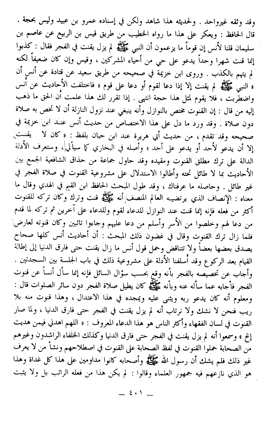 وَأَجَابَ عَنْ تَخْصِيصِهِ بِالْفَجْرِ بِأَنَّهُ وَقَعَ بِحَسَبِ سُؤَالِ السَّائِلِ فَإِنَّهُ إنَّمَا سَأَلَ أَنَسًا عَنْ قُنُوتِ الْفَجْرِ فَأَجَابَهُ عَمَّا سَأَلَهُ عَنْهُ وَبِأَنَّهُ - صَلَّى اللَّهُ عَلَيْهِ وَسَلَّمَ - كَانَ يُطِيلُ صَلَاةَ الْفَجْرِ دُونَ سَائِرِ الصَّلَوَاتِ قَالَ: وَمَعْلُومٌ أَنَّهُ كَانَ يَدْعُو رَبَّهُ وَيُثْنِي عَلَيْهِ وَيُمَجِّدُهُ فِي هَذَا الِاعْتِدَالِ، وَهَذَا قُنُوتٌ مِنْهُ بِلَا رَيْبٍ فَنَحْنُ لَا نَشُكُّ وَلَا نَرْتَابُ أَنَّهُ لَمْ يَزَلْ يَقْنُتُ فِي الْفَجْرِ حَتَّى فَارَقَ الدُّنْيَا، وَلَمَّا صَارَ الْقُنُوتُ فِي لِسَانِ الْفُقَهَاءِ وَأَكْثَرِ النَّاسِ هُوَ هَذَا الدُّعَاءُ الْمَعْرُوفُ: " اللَّهُمَّ اهْدِنِي فِيمَنْ هَدَيْت. . . إلَخْ " وَسَمِعُوا أَنَّهُ لَمْ يَزَلْ يَقْنُتُ فِي الْفَجْرِ حَتَّى فَارَقَ الدُّنْيَا وَكَذَلِكَ الْخُلَفَاءُ الرَّاشِدُونَ وَغَيْرُهُمْ مِنْ الصَّحَابَةِ حَمَلُوا الْقُنُوتَ فِي لَفْظِ الصَّحَابَةِ عَلَى الْقُنُوتِ فِي اصْطِلَاحِهِمْ وَنَشَأَ مَنْ لَا يَعْرِفُ غَيْرَ ذَلِكَ فَلَمْ يَشُكَّ أَنَّ رَسُولَ اللَّهِ - صَلَّى اللَّهُ عَلَيْهِ وَسَلَّمَ - وَأَصْحَابَهُ كَانُوا مُدَاوِمِينَ عَلَى هَذَا كُلِّ غَدَاةٍ وَهَذَا هُوَ الَّذِي نَازَعَهُمْ فِيهِ جُمْهُورُ الْعُلَمَاءِ وَقَالُوا: لَمْ يَكُنْ هَذَا مِنْ فِعْلِهِ الرَّاتِبِ بَلْ وَلَا يَثْبُتُ