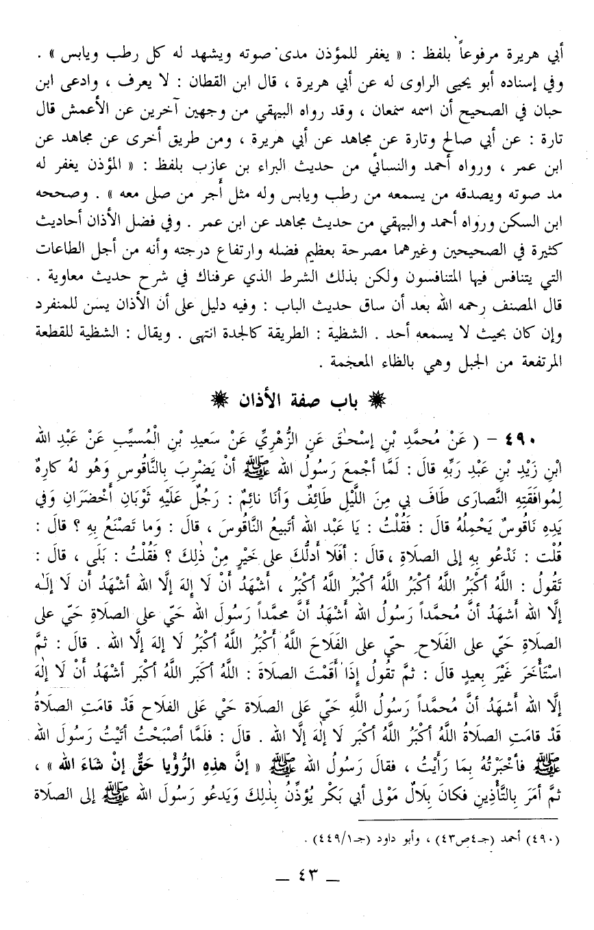 490 - (عَنْ مُحَمَّدِ بْنِ إِسْحَاقَ عَنْ الزُّهْرِيِّ عَنْ سَعِيدِ بْنِ الْمُسَيِّبِ عَنْ عَبْدِ اللَّهِ بْنِ زَيْدِ بْنِ عَبْدِ رَبِّهِ قَالَ: «لَمَّا أَجْمَعَ رَسُولُ اللَّهِ - صَلَّى اللَّهُ عَلَيْهِ وَسَلَّمَ - أَنْ يَضْرِبَ بِالنَّاقُوسِ وَهُوَ لَهُ كَارِهٌ لِمُوَافَقَتِهِ النَّصَارَى طَافَ بِي مِنْ اللَّيْلِ طَائِفٌ وَأَنَا نَائِمٌ: رَجُلٌ عَلَيْهِ ثَوْبَانِ أَخْضَرَانِ، وَفِي يَدِهِ نَاقُوسٌ يَحْمِلُهُ قَالَ: فَقُلْت: يَا عَبْدَ اللَّهِ أَتَبِيعُ النَّاقُوسَ، قَالَ: وَمَا تَصْنَعُ بِهِ؟ قَالَ: قُلْت: نَدْعُو بِهِ إلَى الصَّلَاةِ، قَالَ: أَفَلَا أَدُلُّك عَلَى خَيْرٍ مِنْ ذَلِكَ؟ فَقُلْت: بَلَى، قَالَ: تَقُولُ: اللَّهُ أَكْبَرُ اللَّهُ أَكْبَرُ اللَّهُ أَكْبَرُ اللَّهُ أَكْبَرُ، أَشْهَدُ أَنْ لَا إلَهَ إلَّا اللَّهُ أَشْهَدُ أَنْ لَا إلَهَ إلَّا اللَّهُ أَشْهَدُ أَنَّ مُحَمَّدًا رَسُولُ اللَّهِ أَشْهَدُ أَنَّ مُحَمَّدًا رَسُولُ اللَّهِ حَيَّ عَلَى الصَّلَاةِ حَيَّ عَلَى الصَّلَاةِ حَيَّ عَلَى الْفَلَاحِ حَيَّ عَلَى الْفَلَاحِ اللَّهُ أَكْبَرُ اللَّهُ اللَّهُ أَكْبَرُ لَا إلَهَ إلَّا اللَّهُ. قَالَ: ثُمَّ اسْتَأْخَرَ غَيْرَ بَعِيدٍ قَالَ: ثُمَّ تَقُولُ إذَا أَقَمْت الصَّلَاةَ: اللَّهُ أَكْبَرُ اللَّهُ أَكْبَرُ أَشْهَدُ أَنْ لَا إلَهَ إلَّا اللَّهُ أَشْهَدُ أَنَّ مُحَمَّدًا رَسُولُ اللَّهِ حَيَّ عَلَى الصَّلَاةِ حَيَّ عَلَى الْفَلَاحِ قَدْ قَامَتْ الصَّلَاةُ قَدْ قَامَتْ الصَّلَاةُ اللَّهُ أَكْبَرُ اللَّهُ أَكْبَرُ لَا إلَهَ إلَّا اللَّهُ. قَالَ: فَلَمَّا أَصْبَحْت أَتَيْت رَسُولَ اللَّهِ - صَلَّى اللَّهُ عَلَيْهِ وَسَلَّمَ - فَأَخْبَرْتُهُ بِمَا رَأَيْت، فَقَالَ رَسُولُ اللَّهِ - صَلَّى اللَّهُ عَلَيْهِ وَسَلَّمَ - إنَّ هَذِهِ الرُّؤْيَا حَقٌّ إنْ شَاءَ اللَّهُ ثُمَّ أَمَرَ بِالتَّأْذِينِ فَكَانَ بِلَالٌ مَوْلَى أَبِي بَكْرٍ يُؤَذِّنُ بِذَلِكَ وَيَدْعُو رَسُولَ اللَّهِ - صَلَّى اللَّهُ عَلَيْهِ وَسَلَّمَ - إلَى الصَّلَاةِ