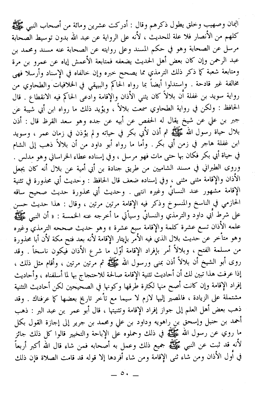 ـــــــــــــــــــــــــــــQوَصُهَيْبٌ وَخَلْقٌ يَطُولُ ذِكْرُهُمْ وَقَالَ: أَدْرَكْت عِشْرِينَ وَمِائَةً مِنْ أَصْحَابِ النَّبِيِّ - صَلَّى اللَّهُ عَلَيْهِ وَسَلَّمَ - كُلُّهُمْ مِنْ الْأَنْصَارِ فَلَا عِلَّةَ لِلْحَدِيثِ، لِأَنَّهُ عَلَى الرِّوَايَةِ عَنْ عَبْدِ اللَّهِ بِدُونِ تَوْسِيطِ الصَّحَابَةِ مُرْسَلٌ عَنْ الصَّحَابَةِ وَهُوَ فِي حُكْمِ الْمُسْنَدِ وَعَلَى رِوَايَتِهِ عَنْ الصَّحَابَةِ عَنْهُ مُسْنَدٌ وَمُحَمَّدُ بْنُ عَبْدِ الرَّحْمَنِ وَإِنْ كَانَ بَعْضُ أَهْلِ الْحَدِيثِ يُضَعِّفهُ فَمُتَابَعَةُ الْأَعْمَشِ إيَّاهُ عَنْ عَمْرِو بْنِ مُرَّةَ وَمُتَابَعَةُ شُعْبَةَ كَمَا ذَكَرَ ذَلِكَ التِّرْمِذِيُّ مِمَّا يُصَحِّحُ خَبَرَهُ، وَإِنْ خَالَفَاهُ فِي الْإِسْنَادِ وَأَرْسَلَا فَهِيَ مُخَالَفَةٌ غَيْرُ قَادِحَةٍ