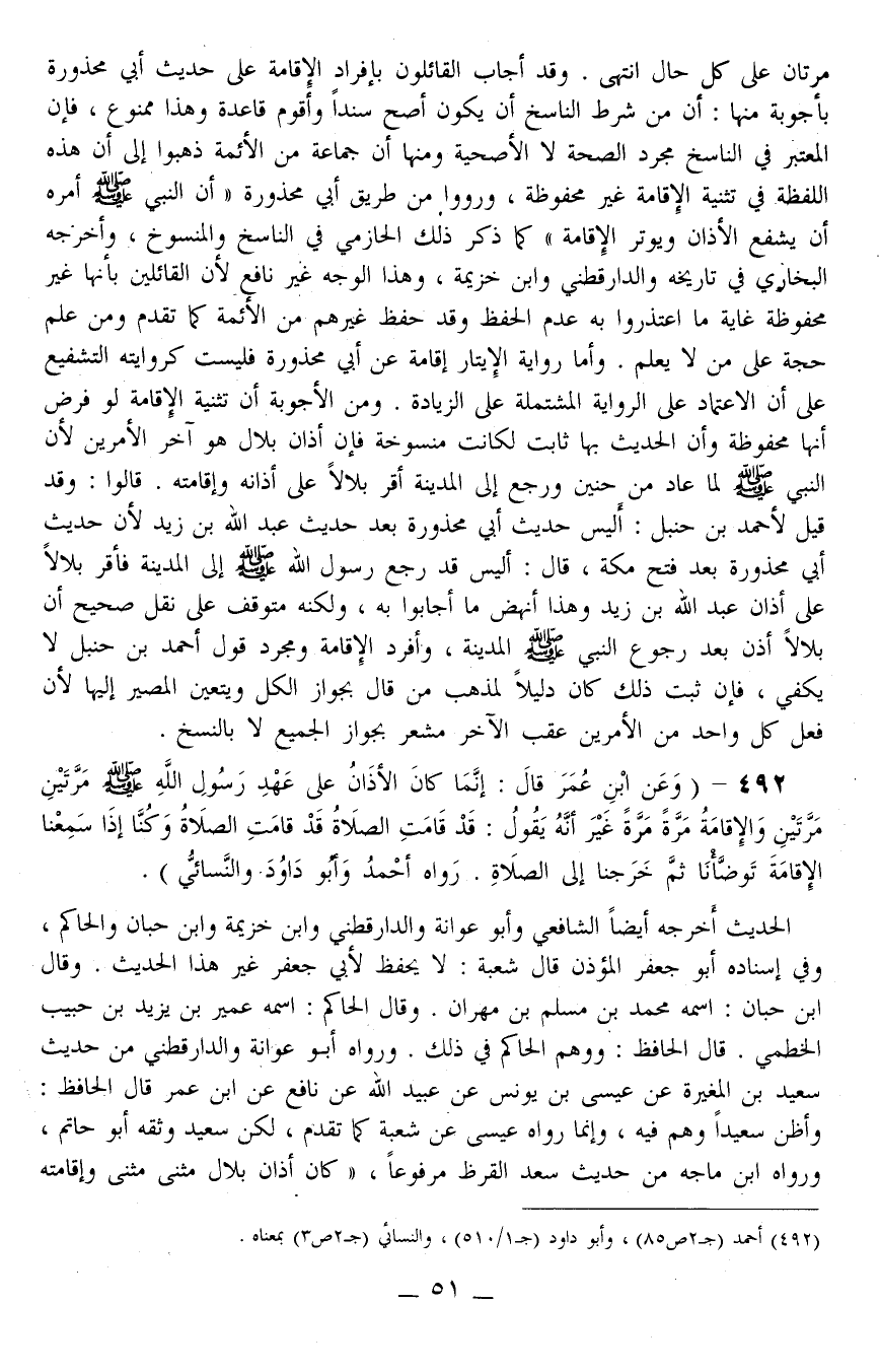 492 - (وَعَنْ ابْنِ عُمَرَ قَالَ: «إنَّمَا كَانَ الْأَذَانُ عَلَى عَهْدِ رَسُولِ اللَّهِ - صَلَّى اللَّهُ عَلَيْهِ وَسَلَّمَ - مَرَّتَيْنِ مَرَّتَيْنِ، وَالْإِقَامَةُ مَرَّةً مَرَّةً غَيْرَ أَنَّهُ يَقُولَ: قَدْ قَامَتْ الصَّلَاةُ قَدْ قَامَتْ الصَّلَاةُ، وَكُنَّا إذَا سَمِعْنَا الْإِقَامَةَ تَوَضَّأْنَا ثُمَّ خَرَجْنَا إلَى الصَّلَاةِ» . رَوَاهُ أَحْمَدُ وَأَبُو دَاوُد وَالنَّسَائِيُّ) . الْحَدِيثُ أَخْرَجَهُ أَيْضًا الشَّافِعِيُّ وَأَبُو عَوَانَةَ وَالدَّارَقُطْنِيّ وَابْنُ خُزَيْمَةَ وَابْنُ حِبَّانَ وَالْحَاكِمُ، وَفِي إسْنَادِهِ أَبُو جَعْفَرٍ الْمُؤَذِّنُ قَالَ شُعْبَةُ: لَا يُحْفَظُ لِأَبِي جَعْفَرٍ غَيْرُ هَذَا الْحَدِيثِ. وَقَالَ ابْنُ حِبَّانَ اسْمُهُ مُحَمَّدُ بْنُ مُسْلِمِ بْنِ مِهْرَانَ.