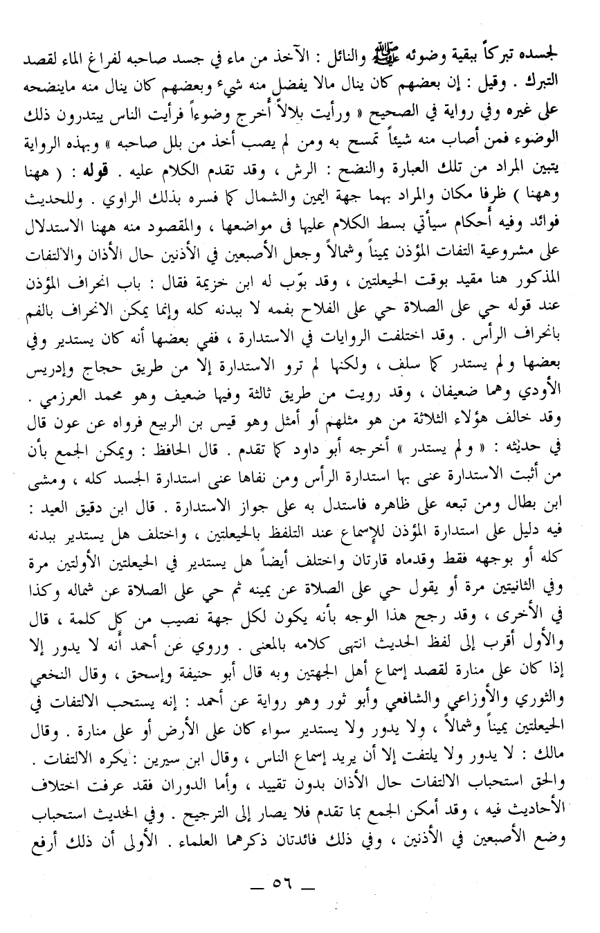 وَقَدْ رُوِيَتْ مِنْ طَرِيقٍ ثَالِثَةٍ وَفِيهَا ضَعِيفٌ وَهُوَ مُحَمَّدٌ الْعَرْزَمِيُّ. وَقَدْ خَالَفَ هَؤُلَاءِ الثَّلَاثَةَ مَنْ هُوَ مِثْلُهُمْ أَوْ أَمْثَلُ وَهُوَ قَيْسُ بْنُ الرَّبِيعِ فَرَوَاهُ عَنْ عَوْنٍ قَالَ فِي حَدِيثِهِ: " وَلَمْ يَسْتَدِرْ " أَخْرَجَهُ أَبُو دَاوُد كَمَا تَقَدَّمَ. قَالَ الْحَافِظُ: وَيُمْكِنُ الْجَمْعُ بِأَنَّ مَنْ أَثْبَتَ الِاسْتِدَارَةَ عَنَى بِهَا اسْتِدَارَةَ الرَّأْسِ وَمَنْ نَفَاهَا عَنَى اسْتِدَارَةَ الْجَسَدِ كُلَّهُ، وَمَشَى ابْنُ بَطَّالٍ وَمَنْ تَبِعَهُ عَلَى ظَاهِرِهِ فَاسْتَدَلَّ بِهِ عَلَى جَوَازِ الِاسْتِدَارَةِ. قَالَ ابْنُ دَقِيقِ الْعِيدِ: فِيهِ دَلِيلٌ عَلَى اسْتِدَارَةِ الْمُؤَذِّنِ لِلْإِسْمَاعِ عِنْدَ التَّلَفُّظِ بِالْحَيْعَلَتَيْنِ، وَاخْتُلِفَ هَلْ يَسْتَدِيرُ بِبَدَنِهِ كُلِّهِ أَوْ بِوَجْهِهِ فَقَطْ، وَقَدَمَاهُ قَارَّتَانِ وَاخْتُلِفَ أَيْضًا هَلْ يَسْتَدِيرُ فِي الْحَيْعَلَتَيْنِ الْأُولَتَيْنِ مَرَّةً وَفِي الثَّانِيَتَيْنِ مَرَّةً أَوْ يَقُولُ حَيَّ عَلَى الصَّلَاةِ عَنْ يَمِينِهِ ثُمَّ حَيَّ عَلَى الصَّلَاةِ عَنْ شِمَالِهِ وَكَذَا فِي الْأُخْرَى، وَقَدْ رُجِّحَ هَذَا الْوَجْهُ بِأَنَّهُ يَكُونُ لِكُلِّ جِهَةٍ نَصِيبٌ مِنْ كُلِّ كَلِمَةٍ، قَالَ وَالْأَوَّلُ أَقْرَبُ إلَى لَفْظِ الْحَدِيثِ انْتَهَى كَلَامُهُ بِالْمَعْنَى