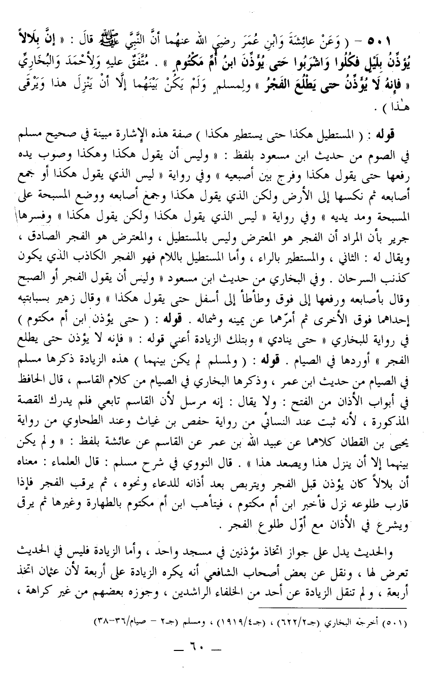 قَالَ النَّوَوِيُّ فِي شَرْحِ مُسْلِمٍ: قَالَ الْعُلَمَاءُ: مَعْنَاهُ أَنَّ بِلَالًا كَانَ يُؤَذِّنُ قَبْلَ الْفَجْرِ وَيَتَرَبَّصُ بَعْدَ أَذَانِهِ لِلدُّعَاءِ وَنَحْوِهِ، ثُمَّ يَرْقُبُ الْفَجْرَ فَإِذَا قَارَبَ طُلُوعُهُ نَزَلَ فَأَخْبَرَ ابْنَ أُمِّ مَكْتُومٍ، فَيَتَأَهَّبُ ابْنُ أُمِّ مَكْتُومٍ بِالطَّهَارَةِ وَغَيْرِهَا ثُمَّ يَرْقَى وَيَشْرَعُ فِي الْأَذَانِ مَعَ أَوَّلِ طُلُوعِ الْفَجْرِ. وَالْحَدِيثُ يَدُلُّ عَلَى جَوَازِ اتِّخَاذِ مُؤَذِّنَيْنِ فِي مَسْجِدٍ وَاحِدٍ، وَأَمَّا الزِّيَادَةُ فَلَيْسَ فِي الْحَدِيثِ تَعَرُّضٌ لَهَا، وَنُقِلَ عَنْ بَعْضِ أَصْحَابِ الشَّافِعِيِّ أَنَّهُ يُكْرَهُ الزِّيَادَةُ عَلَى أَرْبَعَةٍ؛ لِأَنَّ عُثْمَانَ اتَّخَذَ أَرْبَعَةً، وَلَمْ تُنْقَلْ الزِّيَادَةُ عَنْ أَحَدٍ مِنْ الْخُلَفَاءِ الرَّاشِدِينَ، وَجَوَّزَهُ بَعْضُهُمْ مِنْ غَيْرِ كَرَاهَةٍ،