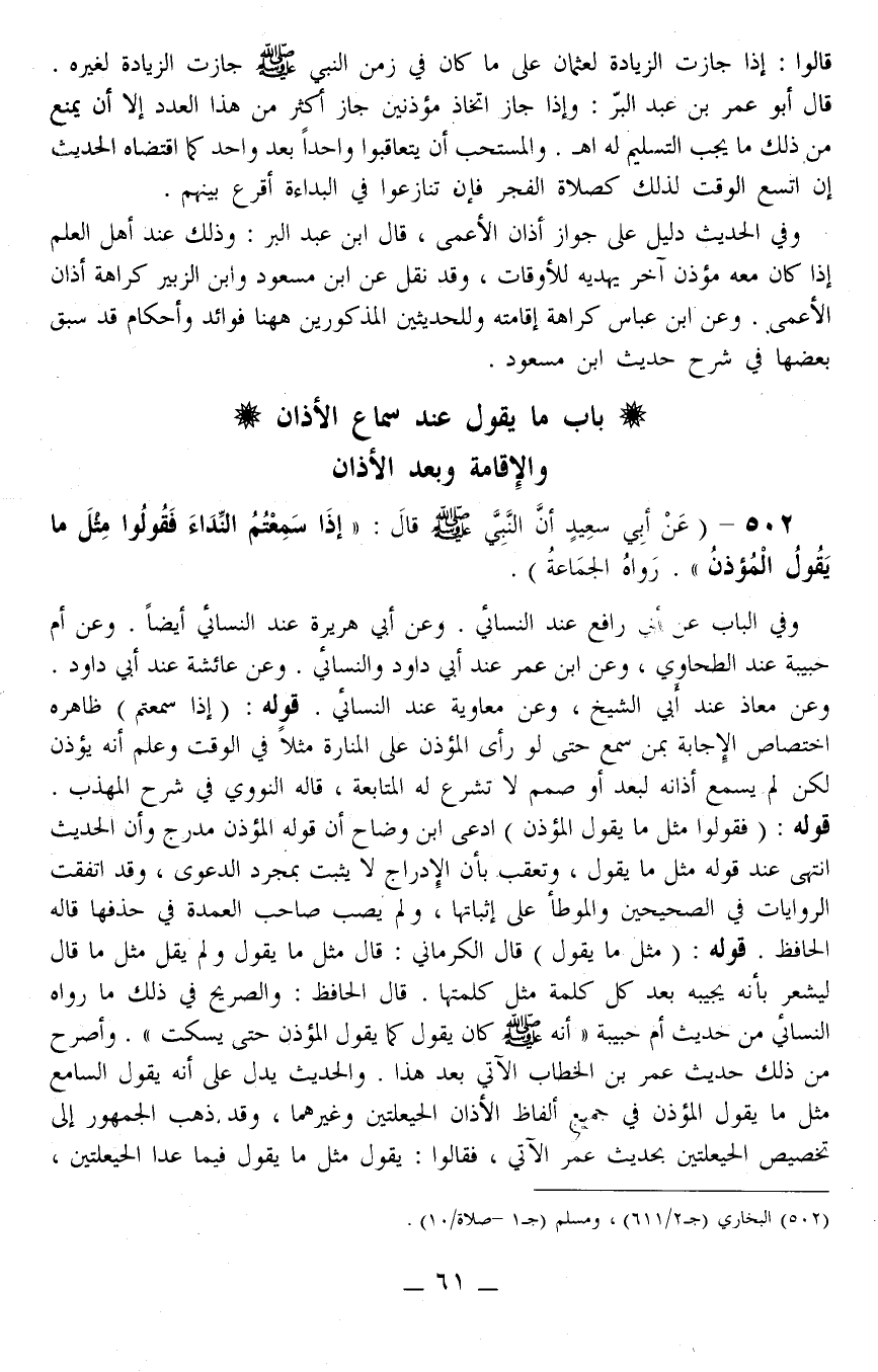 502 - (عَنْ أَبِي سَعِيدٍ أَنَّ النَّبِيَّ - صَلَّى اللَّهُ عَلَيْهِ وَسَلَّمَ - قَالَ: «إذَا سَمِعْتُمْ النِّدَاءَ فَقُولُوا مِثْلَ مَا يَقُولُ الْمُؤَذِّنُ» . رَوَاهُ الْجَمَاعَةُ) .