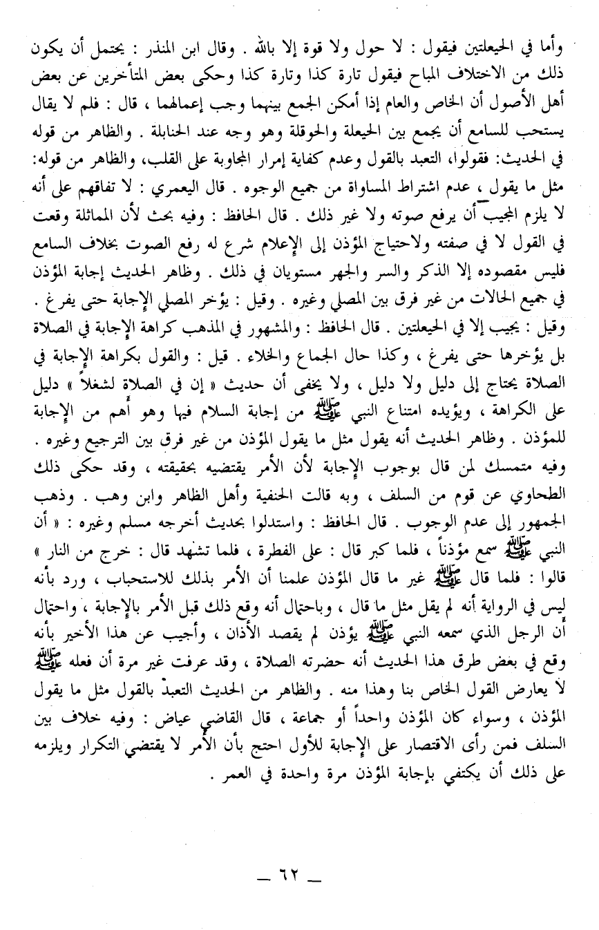 وَذَهَبَ الْجُمْهُورُ إلَى عَدَمِ الْوُجُوبِ. قَالَ الْحَافِظُ: وَاسْتَدَلُّوا بِحَدِيثٍ أَخْرَجَهُ مُسْلِمٌ وَغَيْرُهُ: «أَنَّ النَّبِيَّ - صَلَّى اللَّهُ عَلَيْهِ وَسَلَّمَ - سَمِعَ مُؤَذِّنًا، فَلَمَّا كَبَّرَ قَالَ: عَلَى الْفِطْرَةِ، فَلَمَّا تَشَهَّدَ قَالَ: خَرَجَ مِنْ النَّارِ» قَالُوا: فَلَمَّا قَالَ - صَلَّى اللَّهُ عَلَيْهِ وَسَلَّمَ - غَيْرَ مَا قَالَ الْمُؤَذِّنُ عَلِمْنَا أَنَّ الْأَمْرَ بِذَلِكَ لِلِاسْتِحْبَابِ، وَرُدَّ بِأَنَّهُ لَيْسَ فِي الرِّوَايَةِ أَنَّهُ لَمْ يَقُلْ مِثْلَ مَا قَالَ، وَبِاحْتِمَالِ أَنَّهُ وَقَعَ ذَلِكَ قَبْلَ الْأَمْرِ بِالْإِجَابَةِ، وَاحْتِمَالِ أَنَّ الرَّجُلَ الَّذِي سَمِعَهُ النَّبِيُّ - صَلَّى اللَّهُ عَلَيْهِ وَسَلَّمَ - يُؤَذِّنُ لَمْ يَقْصِدْ الْأَذَانَ، وَأُجِيبَ عَنْ هَذَا الْأَخِيرِ بِأَنَّهُ وَقَعَ فِي بَعْضِ طُرُقِ هَذَا الْحَدِيثِ أَنَّهُ حَضَرَتْهُ الصَّلَاةُ، وَقَدْ عَرَفْت غَيْرَ مَرَّةٍ أَنَّ فِعْلَهُ - صَلَّى اللَّهُ عَلَيْهِ وَسَلَّمَ - لَا يُعَارِضُ الْقَوْلَ الْخَاصَّ بِنَا وَهَذَا مِنْهُ. وَالظَّاهِرُ مِنْ الْحَدِيثِ التَّعَبُّدُ بِالْقَوْلِ مِثْلَ مَا يَقُولُ الْمُؤَذِّنُ، وَسَوَاءٌ كَانَ الْمُؤَذِّنُ وَاحِدًا أَوْ جَمَاعَةً