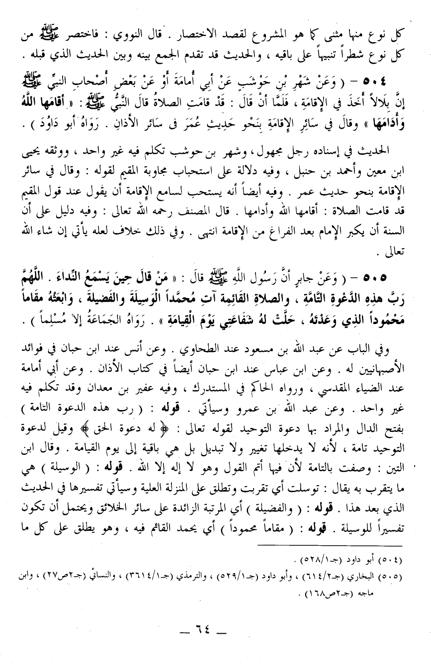504 - (وَعَنْ شَهْرِ بْنِ حَوْشَبٍ عَنْ أَبِي أُمَامَةَ أَوْ عَنْ بَعْضِ أَصْحَابِ النَّبِيِّ - صَلَّى اللَّهُ عَلَيْهِ وَسَلَّمَ - «أَنَّ بِلَالًا أَخَذَ فِي الْإِقَامَةِ، فَلَمَّا أَنْ قَالَ: قَدْ قَامَتْ الصَّلَاةُ قَالَ النَّبِيُّ - صَلَّى اللَّهُ عَلَيْهِ وَسَلَّمَ -: أَقَامَهَا اللَّهُ وَأَدَامَهَا» وَقَالَ فِي سَائِرِ الْإِقَامَةِ بِنَحْوِ حَدِيثِ عُمَرَ فِي سَائِرِ الْأَذَانِ رَوَاهُ أَبُو دَاوُد) . الْحَدِيثُ فِي إسْنَادِهِ رَجُلٌ مَجْهُولٌ، وَشَهْرُ بْنُ حَوْشَبٍ تَكَلَّمَ فِيهِ غَيْرُ وَاحِدٍ، وَوَثَّقَهُ يَحْيَى بْنُ مَعِينٍ وَأَحْمَدُ بْنُ حَنْبَلٍ، وَفِيهِ دَلَالَةٌ عَلَى اسْتِحْبَابِ مُجَاوَبَةِ الْمُقِيمِ لِقَوْلِهِ: وَقَالَ فِي سَائِرِ الْإِقَامَةِ بِنَحْوِ حَدِيثِ عُمَرَ.