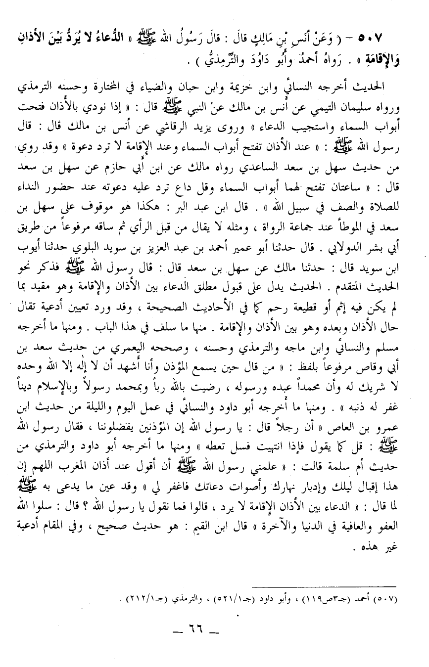 507 - (وَعَنْ أَنَسِ بْنِ مَالِكٍ قَالَ: قَالَ رَسُولُ اللَّهِ - صَلَّى اللَّهُ عَلَيْهِ وَسَلَّمَ - «الدُّعَاءُ لَا يُرَدُّ بَيْنَ الْأَذَانِ وَالْإِقَامَةِ» . رَوَاهُ أَحْمَدُ وَأَبُو دَاوُد وَالتِّرْمِذِيُّ) .