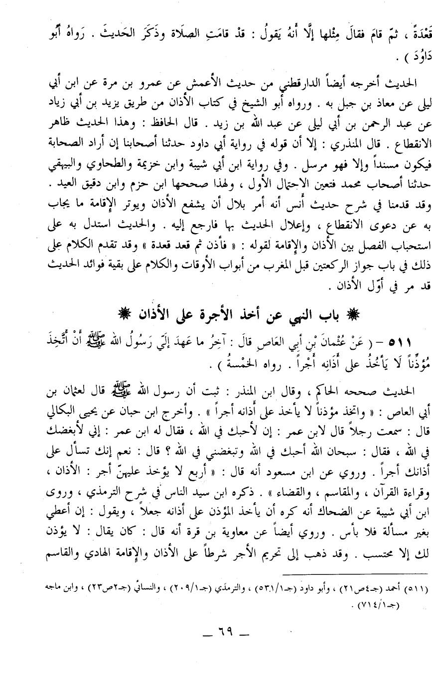 511 - (عَنْ عُثْمَانَ بْنِ أَبِي الْعَاصِ قَالَ: «آخِرُ مَا عَهِدَ إلَيَّ رَسُولُ اللَّهِ - صَلَّى اللَّهُ عَلَيْهِ وَسَلَّمَ - أَنْ أَتَّخِذَ مُؤَذِّنًا لَا يَأْخُذُ عَلَى أَذَانِهِ أَجْرًا» . رَوَاهُ الْخَمْسَةُ)