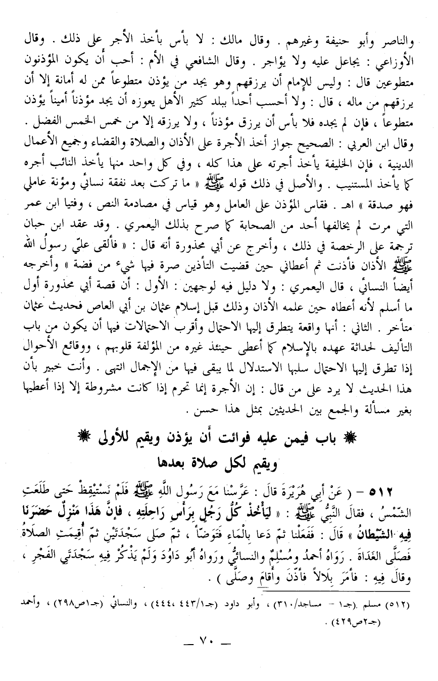 512 - (عَنْ «أَبِي هُرَيْرَةَ قَالَ: عَرَّسْنَا مَعَ رَسُولِ اللَّهِ - صَلَّى اللَّهُ عَلَيْهِ وَسَلَّمَ - فَلَمْ نَسْتَيْقِظْ حَتَّى طَلَعَتْ الشَّمْسُ، فَقَالَ النَّبِيُّ - صَلَّى اللَّهُ عَلَيْهِ وَسَلَّمَ -: لِيَأْخُذْ كُلُّ رَجُلٍ بِرَاسِ رَاحِلَتِهِ، فَإِنَّ هَذَا مَنْزِلٌ حَضَرَنَا فِيهِ الشَّيْطَانُ قَالَ: فَفَعَلْنَا ثُمَّ دَعَا بِالْمَاءِ فَتَوَضَّأَ، ثُمَّ صَلَّى سَجْدَتَيْنِ ثُمَّ أُقِيمَتْ الصَّلَاةُ فَصَلَّى الْغَدَاةَ» رَوَاهُ أَحْمَدُ وَمُسْلِمٌ وَالنَّسَائِيُّ وَرَوَاهُ أَبُو دَاوُد وَلَمْ يَذْكُرْ فِيهِ سَجْدَتَيْ الْفَجْرِ، وَقَالَ فِيهِ: «فَأَمَرَ بِلَالًا فَأَذَّنَ وَأَقَامَ وَصَلَّى» )