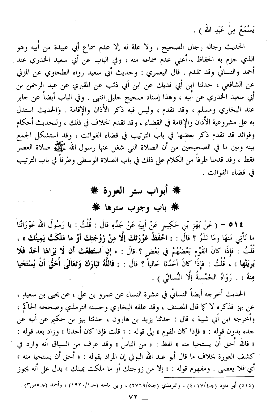 514 - (عَنْ بَهْزِ بْنِ حَكِيمٍ عَنْ أَبِيهِ عَنْ جَدِّهِ قَالَ: قُلْت: يَا رَسُولَ اللَّهِ عَوْرَاتُنَا مَا نَأْتِي مِنْهَا وَمَا نَذَرُ قَالَ: «احْفَظْ عَوْرَتَك إلَّا مِنْ زَوْجَتِك أَوْ مَا مَلَكَتْ يَمِينُك، قُلْت: فَإِذَا كَانَ الْقَوْمُ بَعْضُهُمْ فِي بَعْضٍ؟ قَالَ: إنْ اسْتَطَعْت أَنْ لَا يَرَاهَا أَحَدٌ فَلَا يَرَيَنَّهَا، قُلْت: فَإِذَا كَانَ أَحَدُنَا خَالِيًا؟ قَالَ: فَاَللَّهُ تَبَارَكَ وَتَعَالَى أَحَقُّ أَنْ يُسْتَحْيَا مِنْهُ» . رَوَاهُ الْخَمْسُ إلَّا النَّسَائِيّ) .