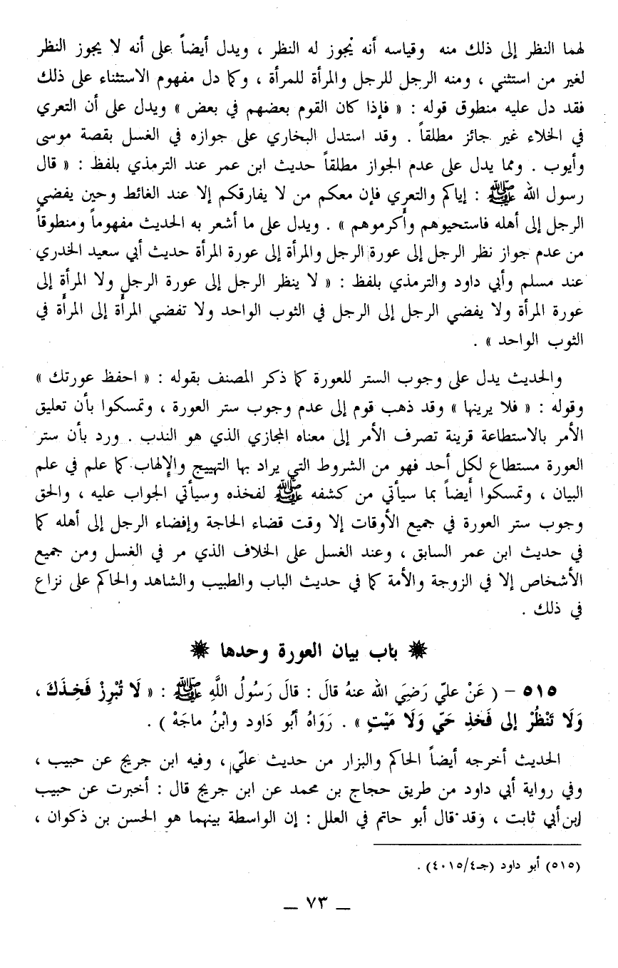515 - (عَنْ عَلِيٍّ - رَضِيَ اللَّهُ عَنْهُ - قَالَ: قَالَ رَسُولُ اللَّهِ - صَلَّى اللَّهُ عَلَيْهِ وَسَلَّمَ -: «لَا تُبْرِزْ فَخِذَك، وَلَا تَنْظُرْ إلَى فَخِذِ حَيٍّ وَلَا مَيِّتٍ» . رَوَاهُ أَبُو دَاوُد وَابْنُ مَاجَهْ) .