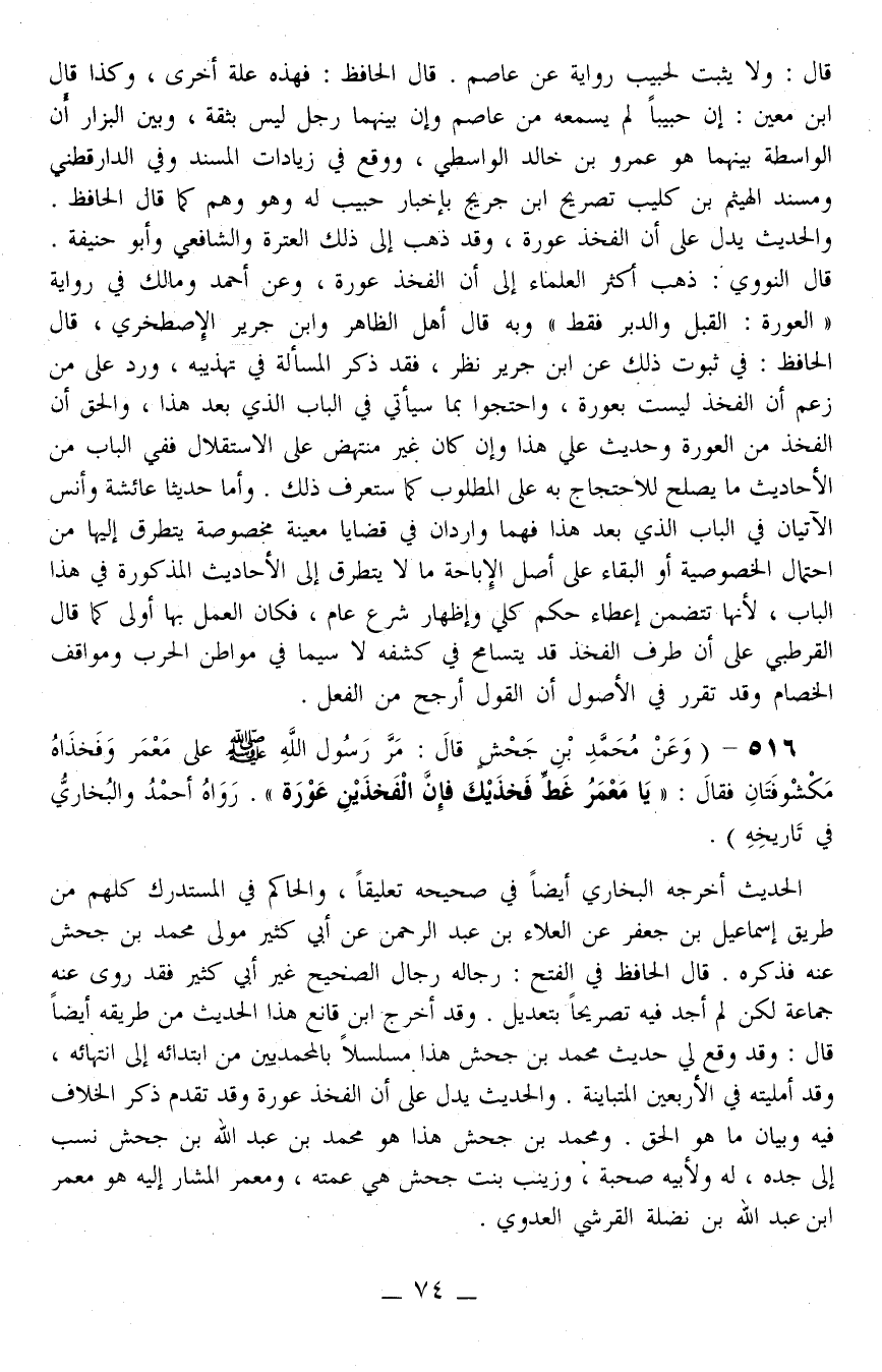 516 - (وَعَنْ مُحَمَّدِ بْنِ جَحْشٍ قَالَ: «مَرَّ رَسُولُ اللَّهِ - صَلَّى اللَّهُ عَلَيْهِ وَسَلَّمَ - عَلَى مَعْمَرٍ وَفَخِذَاهُ مَكْشُوفَتَانِ فَقَالَ: يَا مَعْمَرُ غَطِّ فَخِذَيْك فَإِنَّ الْفَخِذَيْنِ عَوْرَةٌ» . رَوَاهُ أَحْمَدُ وَالْبُخَارِيُّ فِي تَارِيخِهِ) . الْحَدِيثُ أَخْرَجَهُ الْبُخَارِيُّ أَيْضًا فِي صَحِيحِهِ تَعْلِيقًا، وَالْحَاكِمُ فِي الْمُسْتَدْرَكِ كُلُّهُمْ مِنْ طَرِيقِ إسْمَاعِيلَ بْنِ جَعْفَرٍ عَنْ الْعَلَاءِ بْنِ عَبْدِ الرَّحْمَنِ عَنْ أَبِي كَثِيرٍ مَوْلَى مُحَمَّدِ بْنِ جَحْشٍ عَنْهُ فَذَكَرُهُ. قَالَ الْحَافِظُ فِي الْفَتْحِ: رِجَالُهُ رِجَالُ الصَّحِيحِ غَيْرَ أَبِي كَثِيرٍ فَقَدْ رَوَى عَنْهُ جَمَاعَةٌ لَكِنْ لَمْ أَجِدْ فِيهِ تَصْرِيحًا بِتَعْدِيلٍ. وَقَدْ أَخْرَجَ ابْنُ قَانِعٍ هَذَا الْحَدِيثَ مِنْ طَرِيقِهِ أَيْضًا قَالَ: وَقَدْ وَقَعَ لِي حَدِيثُ مُحَمَّدِ بْنِ جَحْشٍ هَذَا مُسَلْسَلًا بِالْمُحَمَّدِيِّينَ مِنْ ابْتِدَائِهِ إلَى انْتِهَائِهِ، وَقَدْ أَمْلَيْتُهُ فِي الْأَرْبَعِينَ الْمُتَبَايِنَةِ. وَالْحَدِيثُ يَدُلُّ عَلَى أَنَّ الْفَخِذَ عَوْرَةٌ وَقَدْ تَقَدَّمَ ذِكْرُ الْخِلَافِ فِيهِ، وَبَيَانُ مَا هُوَ الْحَقُّ. وَمُحَمَّدُ بْنُ جَحْشٍ هَذَا هُوَ مُحَمَّدُ بْنُ عَبْدِ اللَّهِ بْنِ جَحْشٍ نُسِبَ إلَى جَدِّهِ، لَهُ وَلِأَبِيهِ صُحْبَةٌ وَزَيْنَبُ بِنْتُ جَحْشٍ هِيَ عَمَّتُهُ، وَمَعْمَرٌ الْمُشَارُ إلَيْهِ هُوَ مَعْمَرُ بْنُ عَبْدِ اللَّهِ بْنِ نَضْلَةَ الْقُرَشِيُّ الْعَدَوِيِّ