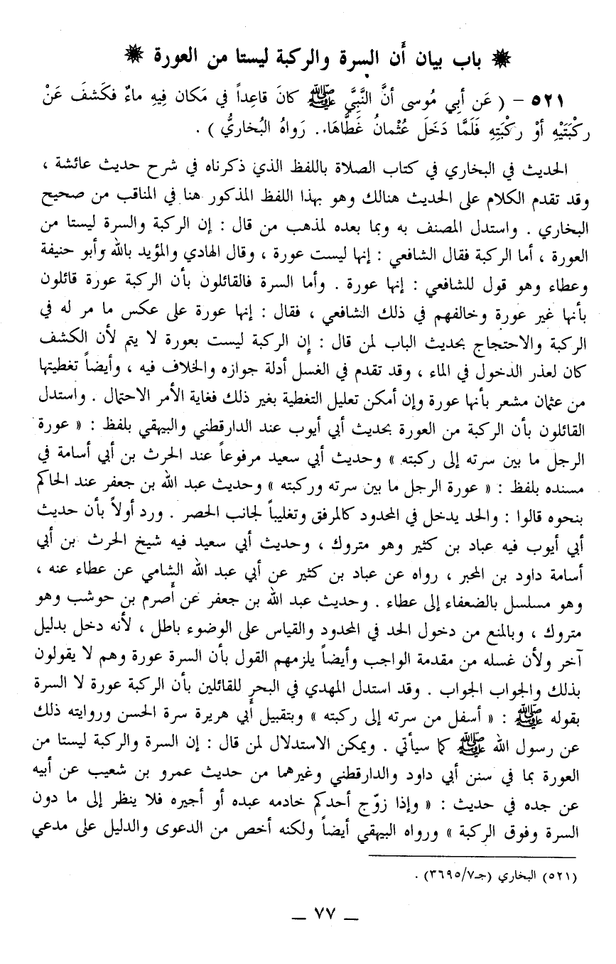 521 - (عَنْ أَبِي مُوسَى «أَنَّ النَّبِيَّ - صَلَّى اللَّهُ عَلَيْهِ وَسَلَّمَ - كَانَ قَاعِدًا فِي مَكَان فِيهِ مَاءٌ فَكَشَفَ عَنْ رُكْبَتَيْهِ أَوْ رُكْبَتِهِ فَلَمَّا دَخَلَ عُثْمَانُ غَطَّاهَا» . رَوَاهُ الْبُخَارِيُّ) .